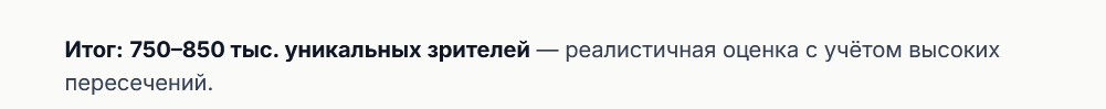 Как думаете, примерно верно иишка оценила? Посмотрела я его расчеты, вроде нет грубых ошибок. Только еще мне кажется, что зрители ближе к ца Гатилова, поэтому все не так уж печально. >>6243327 Он предлагает не форсить новость, т.к. это вредит Землеройке.