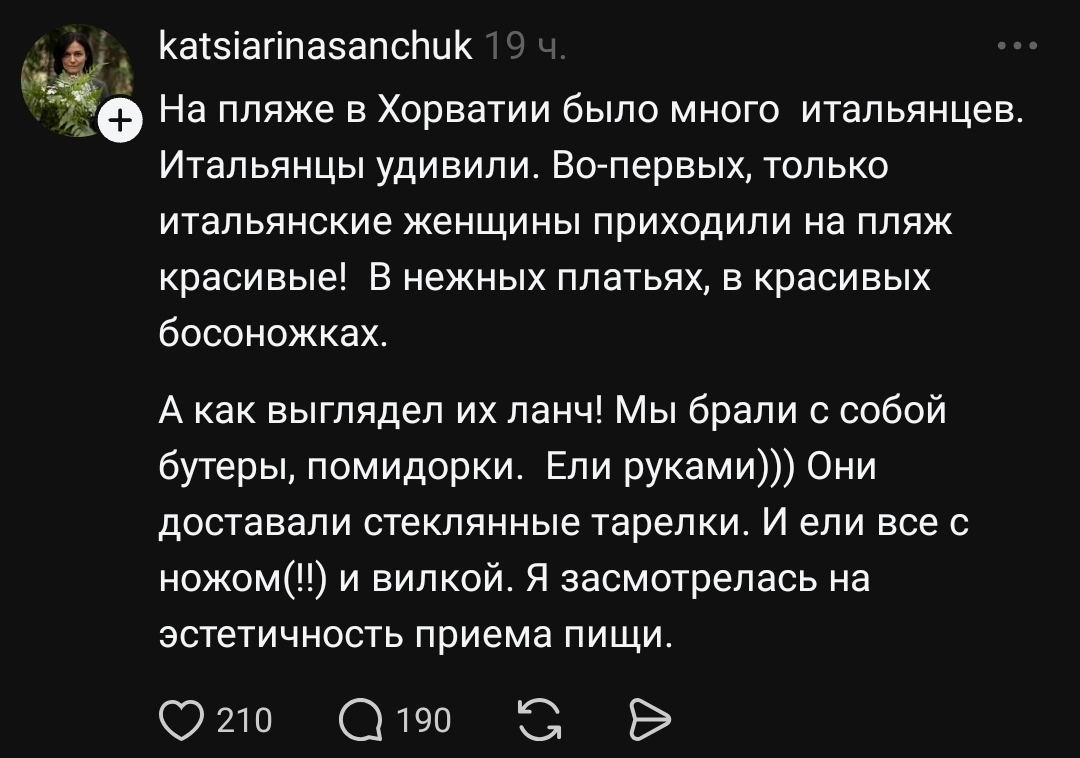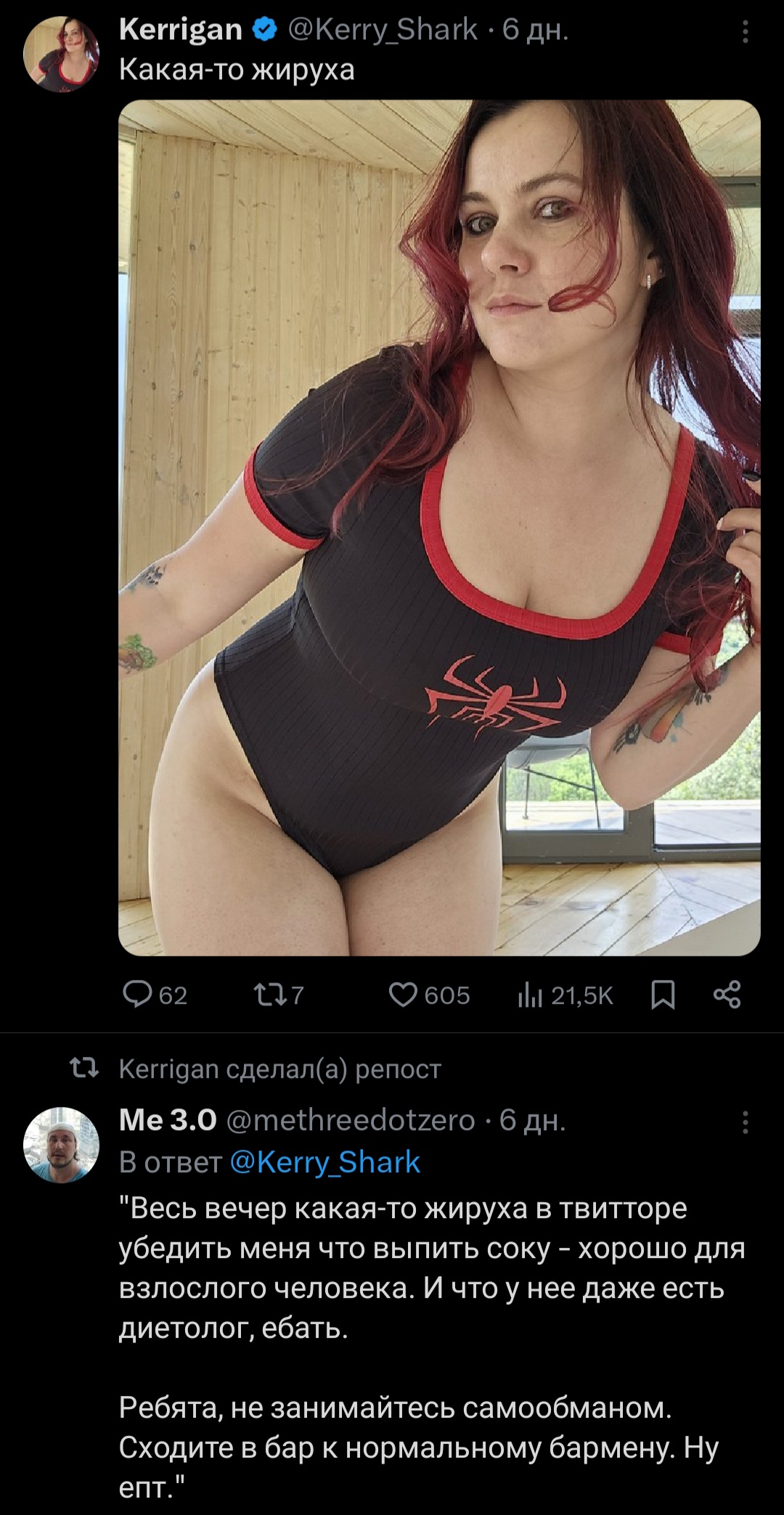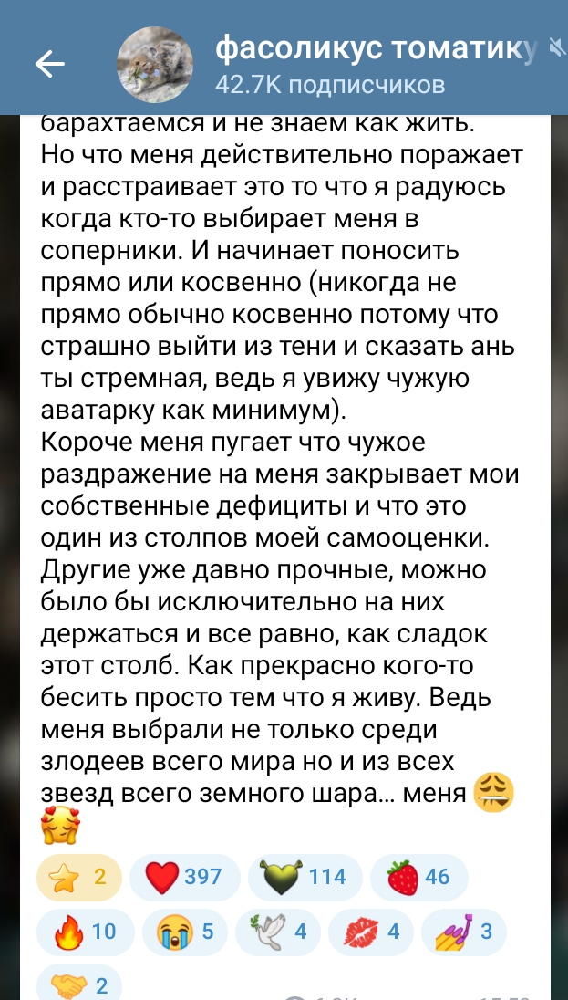 Фактически пока единственный результат всего этого — Землеройка перестала что-то постить про отношения. Интересно, когда начнет снова. Мне кажется, ей и подарки были нужны в большей степени, чтобы в соцсетки их постить, а тут не запостишь. Кстати, сиса одна итт писала, что Землеройка пополамит. Я полистала ее тт и уверена в этом на 90%.