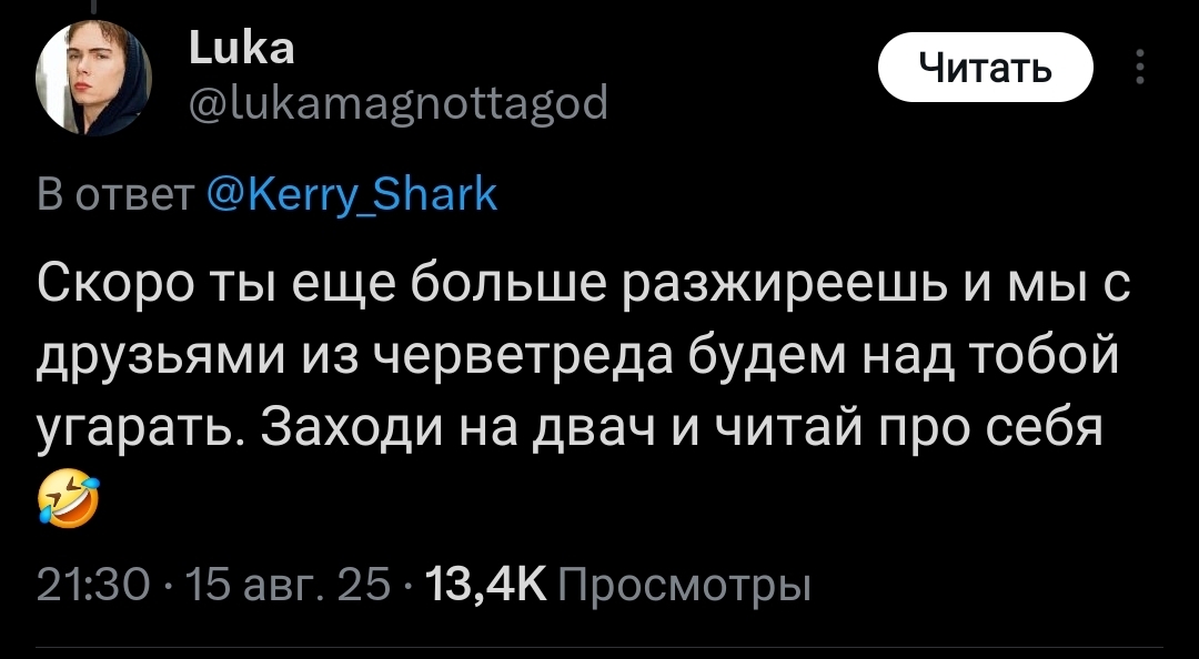 >>6243327 ебанашки, которые получили возможность затравить легкую мишень, при этом еще чето говорили про конфоблядей. ничем не отличаются от них же, такие же говноедки доносчицы. началось все со стенаний про то, как Влад затравил Тати и сломал ей жизнь и карьеру стримерши, в итоге делают то же самое. но это богоугодная травля, оправданная