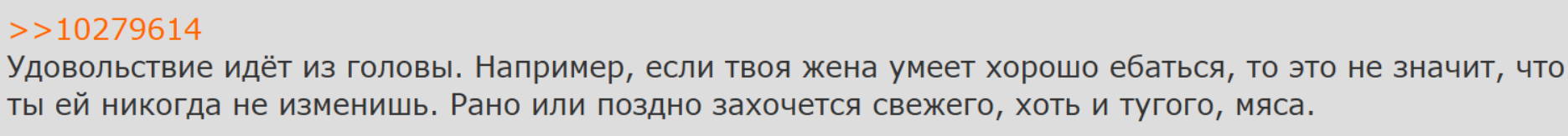 >>6246016 >а зачем выбирать того кого не уважаешь? Чуханов нельзя уважать в любом случае, их можно только юзать >суть в том что бы выбрать как раз того кто умный, логичный, стабильный, с одинаковыми интересами, уметь его направить туда, куда тебе нужно. Примерно так и делаю, просто эмоциональной привязки нет. Я вообще в любовь не верю, мне химия между людьми ирл неинтересна, мне интересна материальная сторона потому что это все что у нас есть. Любовные романы я читаю как фантастику, т.к. там зачастую фигуририруют всякие соулмейства, предназначения и т.п. чего в реально жизни нет >Речи про то, чтобы быть мясом для ебли лишь бы не работать - не было Базовый закон ты мне я тебе, вопрос в том кто вложится больше. А в какую обертку это завернуть дело десятое >>6246018 >униженную бабскую попущенную мудроженственную роль Олежа, а ты все по тредам скачешь как козочка, да?