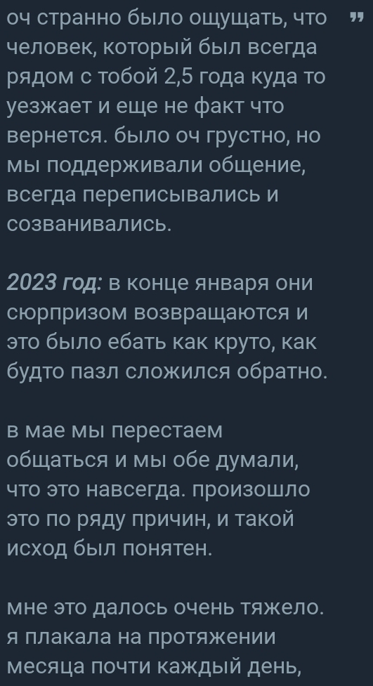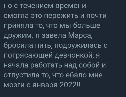 Несу самый интересный фрагмент про "ебаный период засаливания в 2022" и резкое прекращение и возобновление общения в 2023. Как раз все сходится со старым рассказом Мармы со стрима, что ей психуелог сказала общаться только с людьми, приносящими позитивные эмоции, а официанточка еще тогда не "бросила пить" (как они интересно и завуалированно говорят про меф), и Маша чтоб не срываться решила с ней перестать дружить))