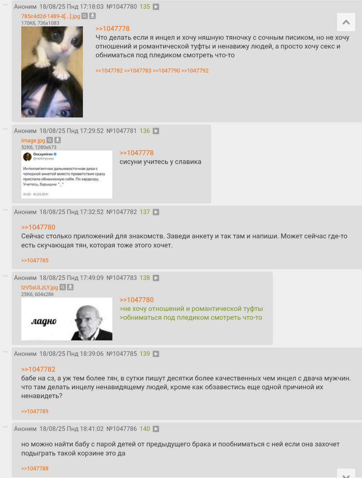 >>6240528 на таких отношениях как сейчас они и правда могут хоть до пятилетки дожить, но от этого отношения не становятся серьёзными. он с ней гуляет, куда-то катает потому что ему в прикол провести время с кем-то и потрахать молодой писик, заглядывабщий ему в рот, а элементарно прийти и полочку прикрутить - это уж извините, я занят. какая тут серьёзность? если к нему с небес валя карнавал спустится - шлюма пойдёт нахуй, сама шлюма станет неудобной (читать как: начнёт требовать большего) - пойдёт нахуй. может в следующем году или через пару лет съедутся, но в таком случае быстро стухнут пиписинки. да и думаю она его с удовольствием бы скипнула если бы кумир посерьёзнее нечаянно обратил на фею внимание. сначала бы закуколдила как дениску, а потом уж и скипнула, но к счастью или сожалению ей такая участь светит также ярко как поеху валюша, а может и ещё меньше.