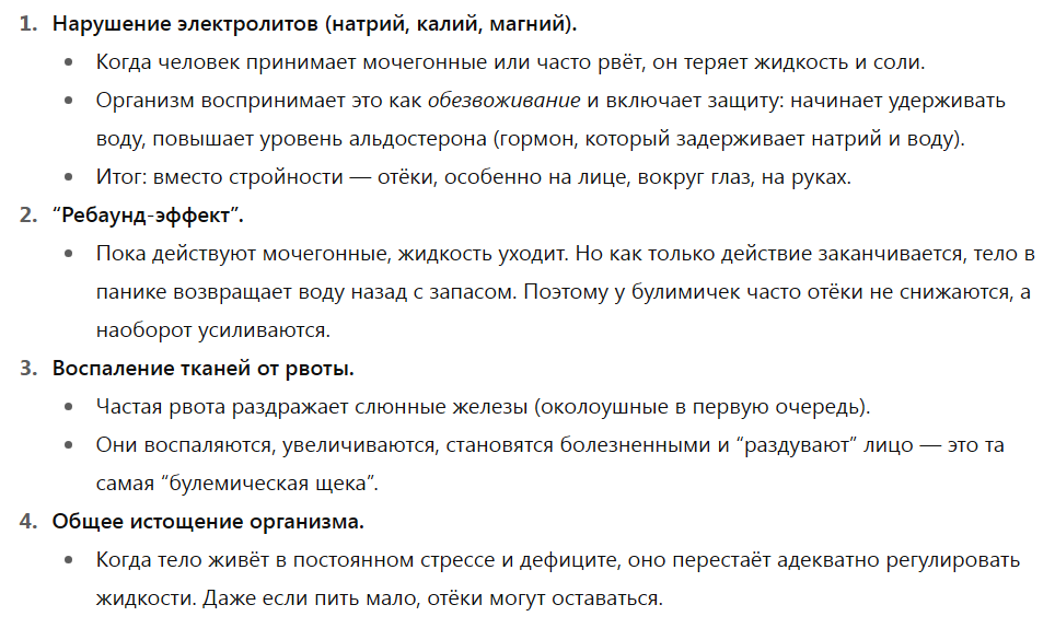 >>6249025 конечно, объясню чисто по своему опыту, потому что я рппшизила долго и в разных проявлениях. часто рппшницы стараются бороться с отеками которые есть у всех нормальных людей с помощью таблеток, которые называют мочегонными (их обычно назначают для вывода соли, воды и понижения давления, но продают в любой без рецепта). эти таблетки действительно помогают, потому что отеки уходят на 12 часов+-, а потом вся вода возвращается в большем объеме. я на утро после таблеток (пила перед сном) ощущала дикую жажду, по литру воды с утра выпивала, чтобы просто сухость ушла. на следующий день, соответственно, вся эта вода выходит в новые отеки. пьешь больше таблеток, а организм привыкает, отекаешь сильнее с каждым разом. со слабительными, которыми грешат рппшизки, примерно та же история, но отеки часто сразу после «процесса». они приходят из-за того, что для переваривания пищи много воды необходимо, а таблетками ты этот процесс ускоряешь. так же отеки проходят, когда ты в целом начинаешь есть, пить, жить не в таких сильных рамках: организм не справляется с таким количеством еды и резкий переход вызывает сильные отеки, пот, усталость. в этой ситуации, шаг влево или вправо – уже выглядишь иначе. а для мозга рппшизки это смертельно, сразу ощущаешь себя ничтожной и делаешь всё, чтобы исправить ситуацию. замкнутый круг, в котором застряла и карина. жалко на самом деле.