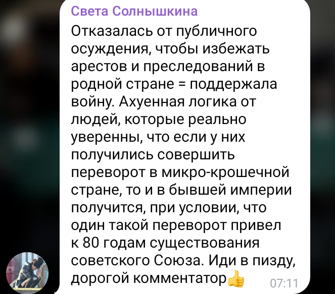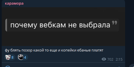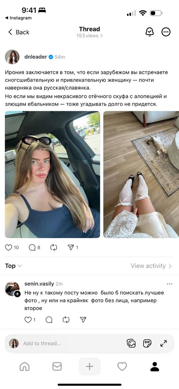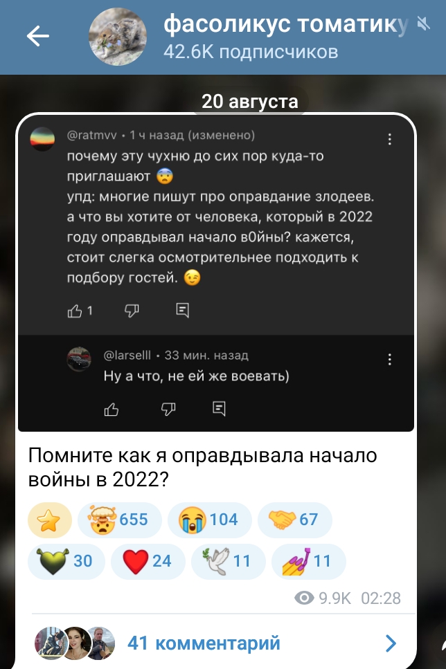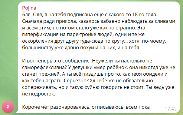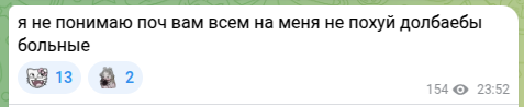 Ну в смысле почему не похуй, подруга, ты ж плотно сидишь на нарциссической игле любых реакций на твою жизнь и намеренно делаешь реакционный контент, че за лицемерие.