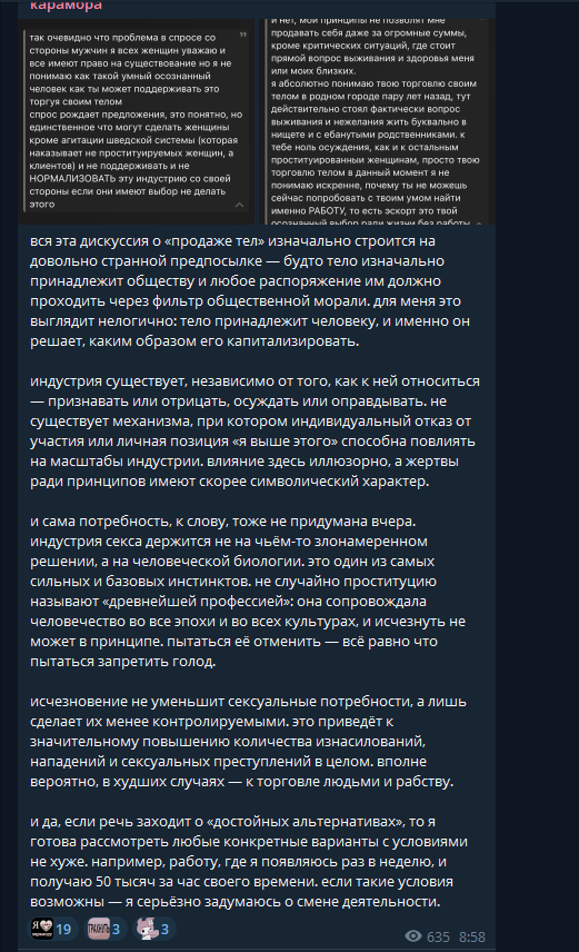 "я не пропагандирую эту сферу, сознательно не говорю об этом в тиктоке, не выставляю в виде «идеальной картинки», не создаю иллюзию, будто всё легко и прекрасно, не делюсь советами как туда вкатиться.