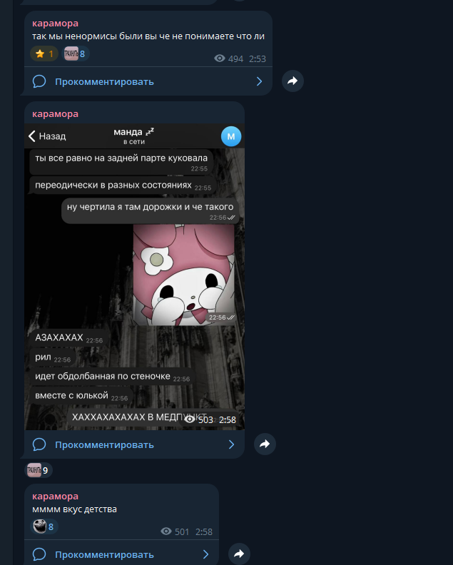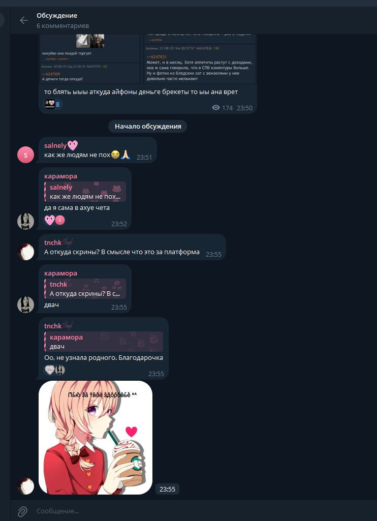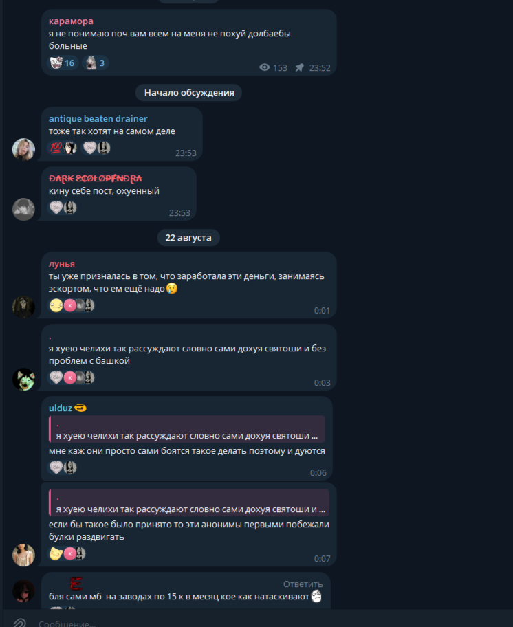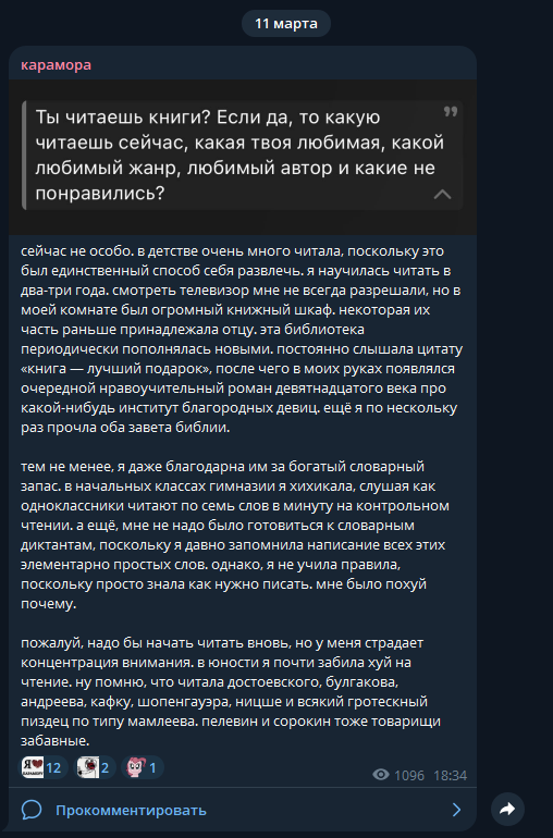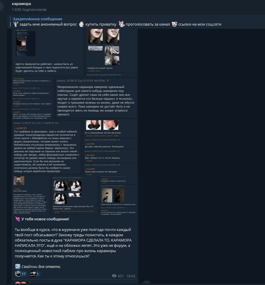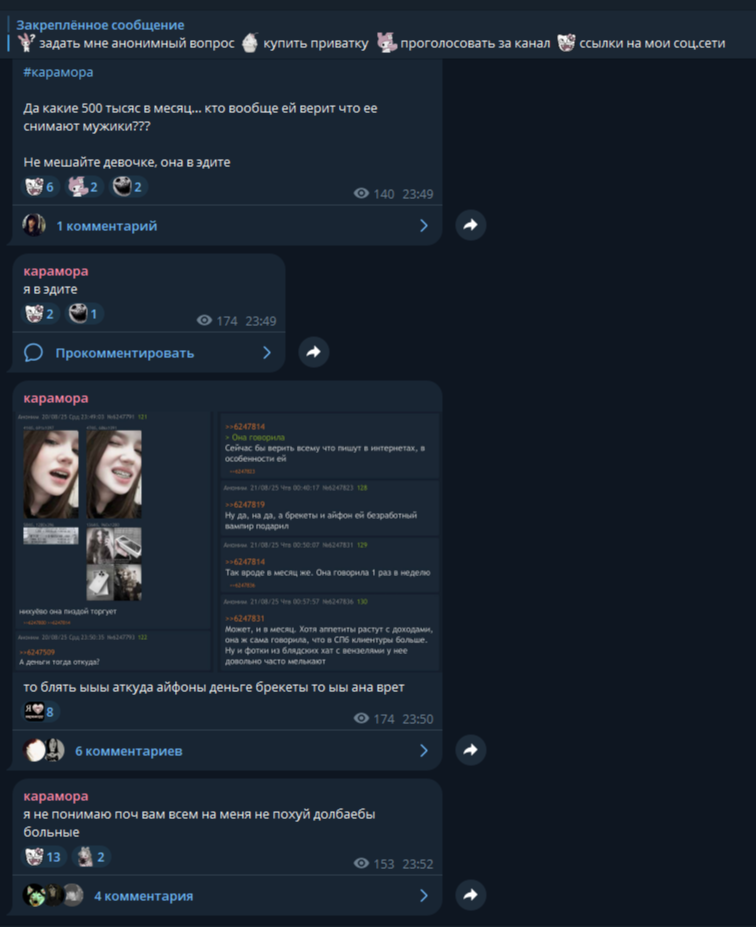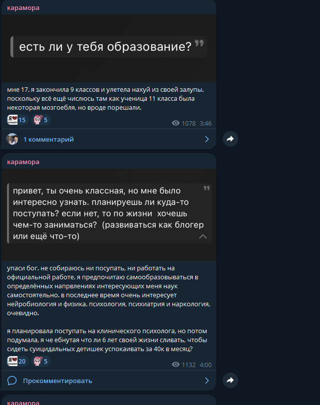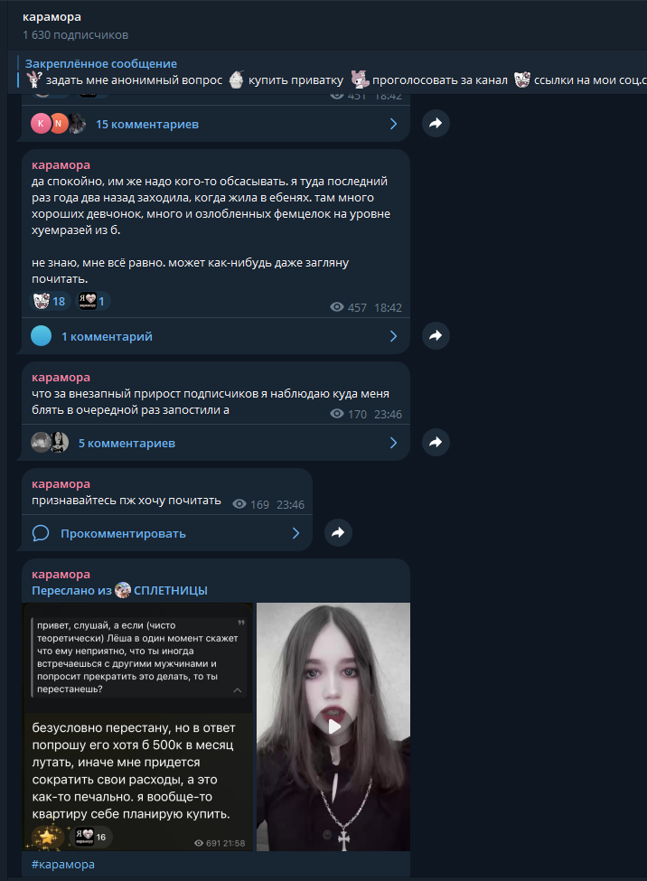 Я считаю Настюша (карамора) патологическая вруша, то что она эскортница думаю факт, а другие факты биографии очень преувеличены. Если читать внимательно её посты, то видны несоответствия в мелочах, что уж говорить об общей биографии. То она апатичная пизда без интереса к жизни (ой как завидую малолетке, которая тратит деньги и при этом страдает что ей ничего не приносит удовольствие), то она квантовый физик нейробиолог с любовью к андеграундной русской литературе. Буквально: ой, я изучаю психологию и читаю книжки, в следующем посте о том что она в руках книгу не держала 8 лет. Маня завралась, либо же не может выбрать какой образ ей предпочтителен. Но её малолетняя аудитория не умеет думать, а видит только образ и хавает с радостью.