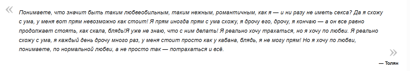 Ютуб подсунул какой-то подкаст с ним, и я натурально сдохла. Манера речи педовки, косящей под Базарова (или Невзорова), рассказы про то, как он трахал каких-то там актрис и супермоделей, какие-то постоянные апелляции к супер-генетике обсуждаемых людей, заигрывания на камеру, чтобы про него писали фанфики (!!!). Короче у меня аж кринжевые муражки по коже пошли, пока я это слушала, а у него почти лям на ютубе...