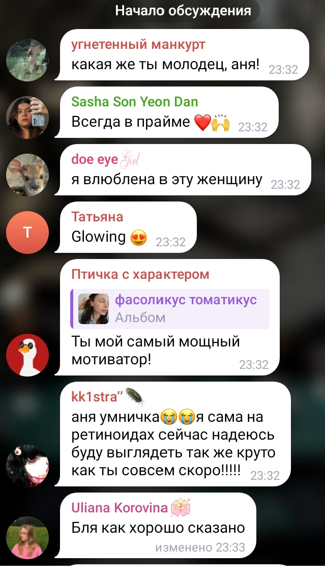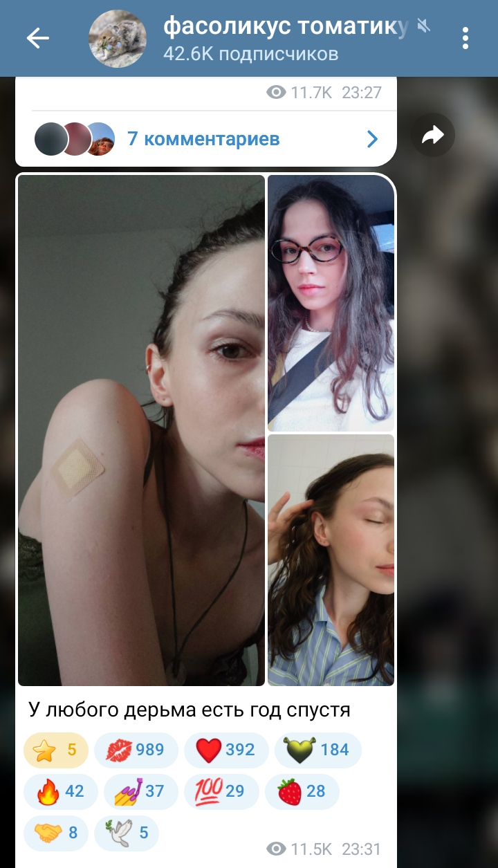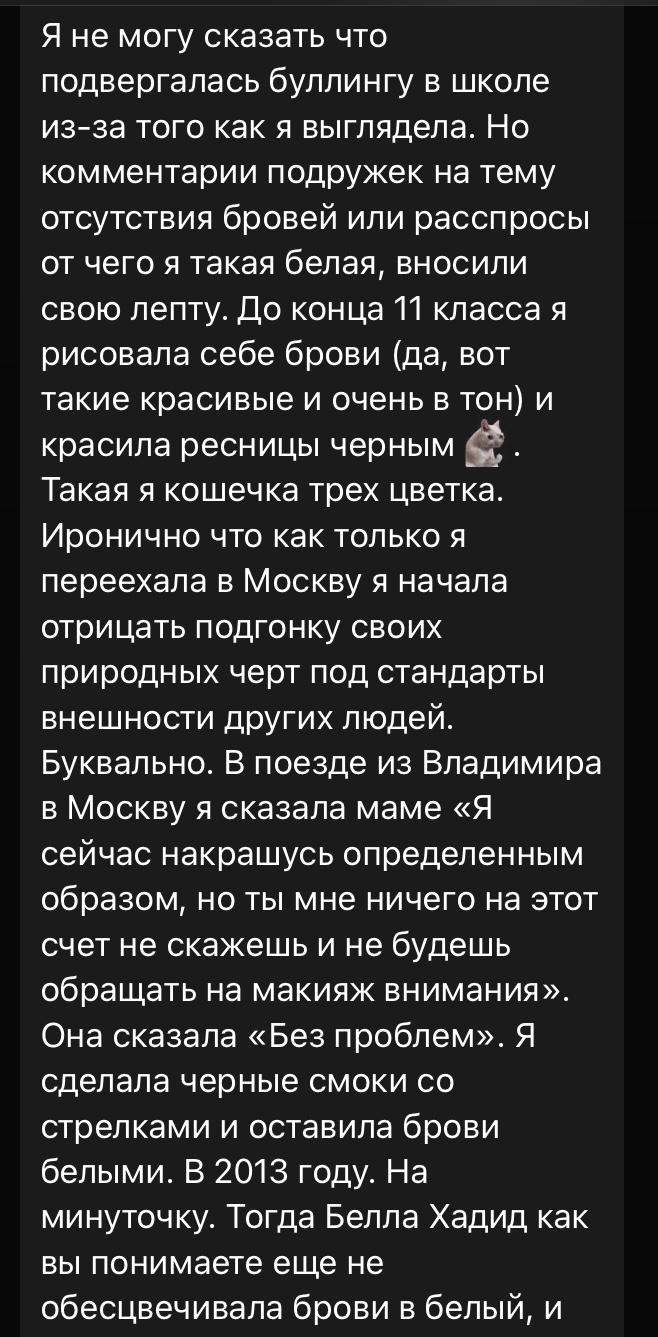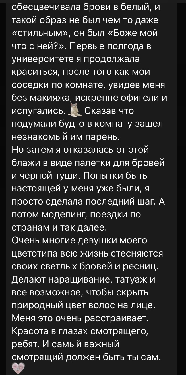 с другой стороны, скрывать правду я тоже не намерена. мой канал — это пространство, где я хотела бы быть собой. а если замалчивать опыт, выбор и последствия, о каком же тогда выражении настоящей личности может идти речь?"