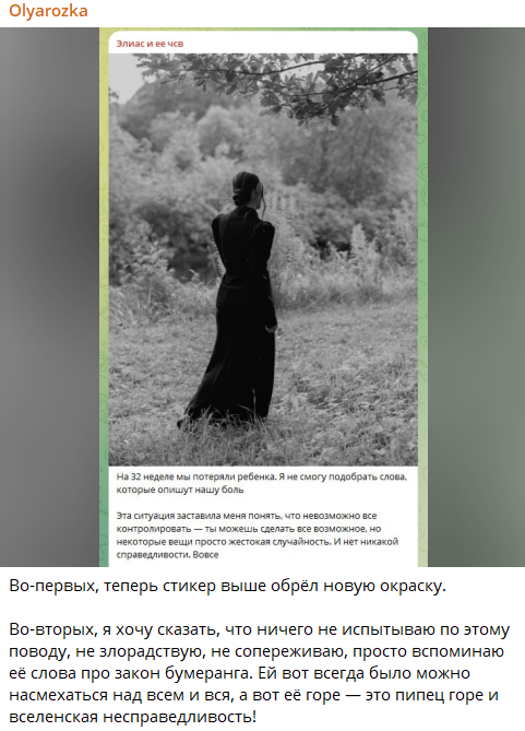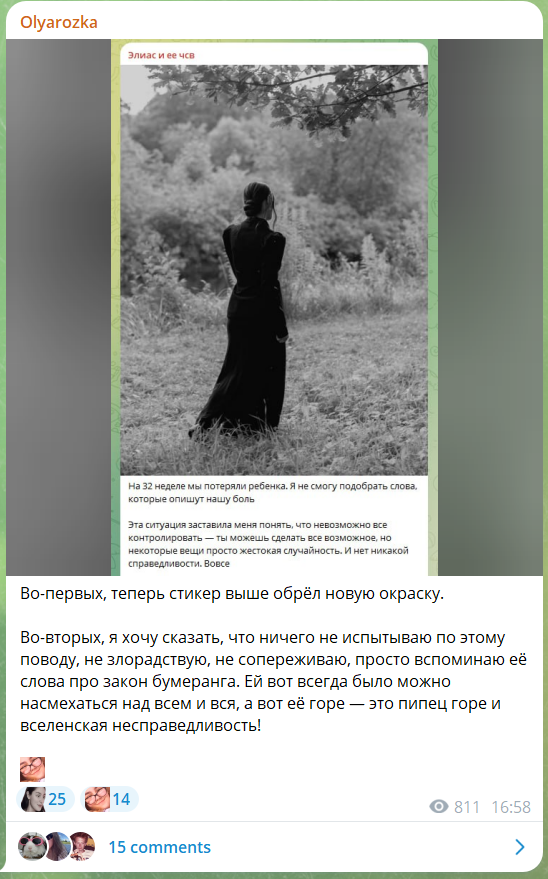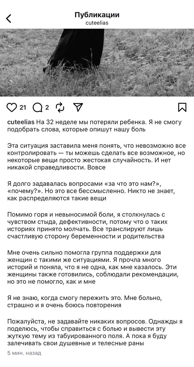 Вообще очень странная история, во многом из-за срока еще такого. Она же скрывала беременность как можно дольше, потому что опасалась рисков. На таких сроках уже все стабильно, и тут такая новость. И эта фотосессия траурная незадолго до.