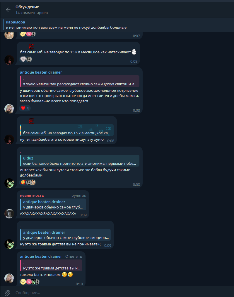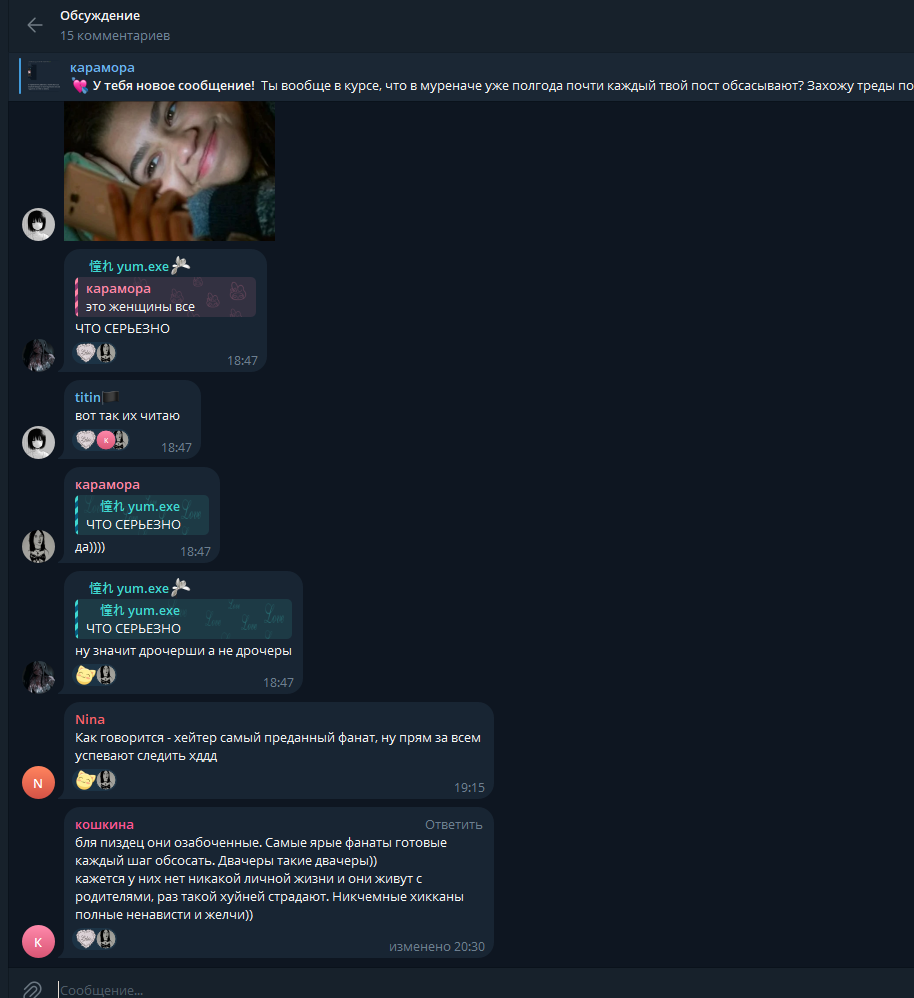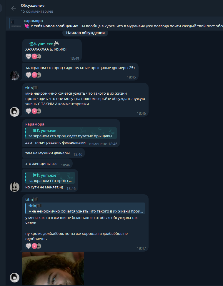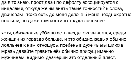 >>6249093 Ой, клуша. Травят как раз мужики, добираясь до родственников и всех мест работы, отравляют жизнь, а на тяначе чисто кости перемывают. И вспомнив Женечку-фидера, который вполне себе нормис, можно охуеть от того, что двачеры эт обычные люди, по которым и не скажешь, что в них столько дерьма