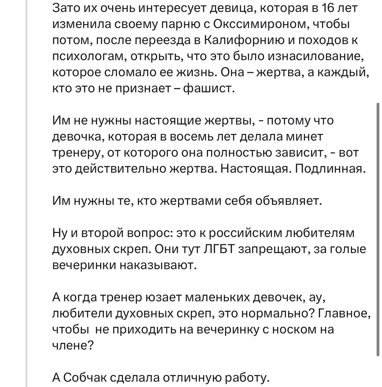 >>6248975 Нихуя не знаю об этом тренере, но это просто эффект медийного имени. Плюс, изнасилование 8-летнего ребенка просто абсолютно однозначно с точки зрения морали, сомахотела тут не скажешь. Тренер - однозначно насильник. Осуждение со стороны либерах из Тель-Авива и Берлина тут нихуя не поможет, тащемта, хуле они сделают тренеру в Ростове? Это банальное однозначное изнасилование, тут общественность разве что может мусорам написать, чтобы дело двинуть. НО и это Собчак сама с большей эффективностью сделает, чем какие-то сомнительные с точки зрения власти персонажи.