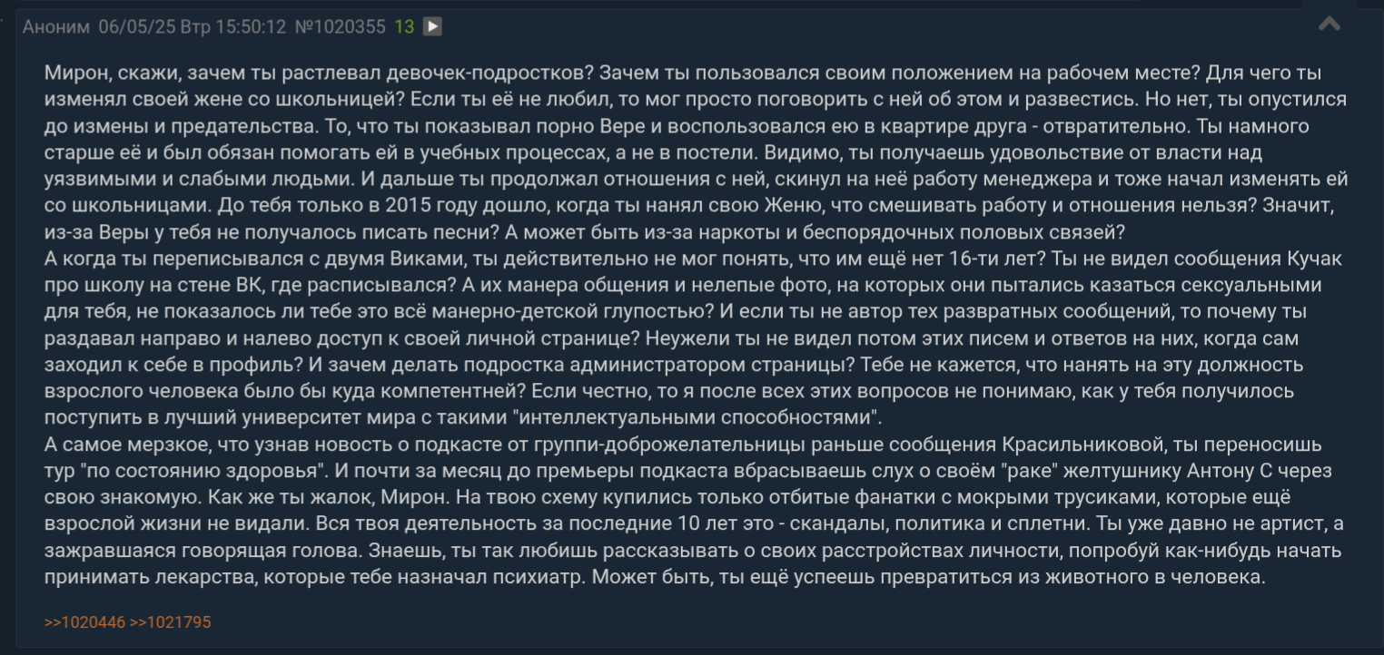 >>6248975 Про ситуацию с оксимироном база. Там прожженная девочка16 лет сама была рада. Она хотела быть с ним и ей все нравилось и она кайфовала. Как любая фанатка чунгука также мечтает быть с ним