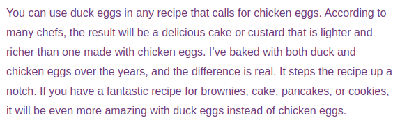 >>6123336 Говорят, что с утиными яйцами выпечка и десерты гораздо вкуснее получаются, чем с куриными. Типа более насыщенный вкус и текстура мягче и более воздушная. Ток надо сначала почитать про особенности выпечки с ними.