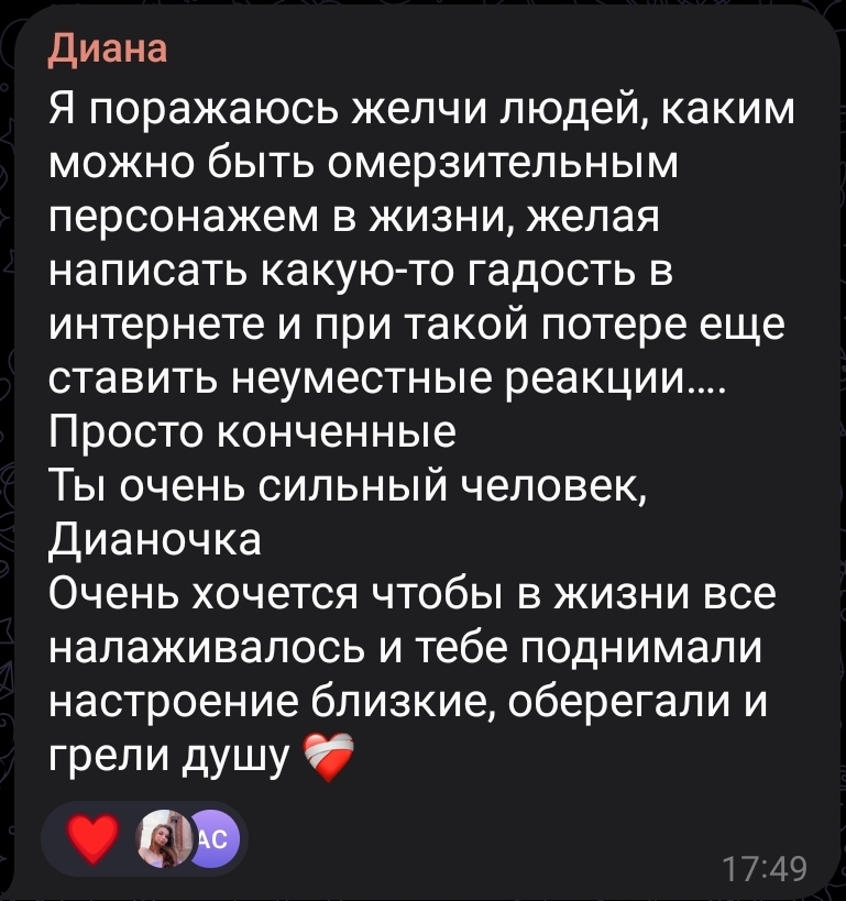 >>6259745 Пишет-то она нормальные вещи, просто не учитывает, что она сама по себе говна палата и никто лицемерить в такой момент не будет. Ей слова поддержки - она что-нибудь токсичное выдаст (а раньше позвонить не мог? что мне от твоих слов?) или вообще эмоционально повиснет. Я считаю, что в такой момент должны поддерживать только те, кто на это готов. Сочувствую чисто по-человечески, всякое бывает. Бабушка потеряла второго ребенка, он умер через несколько месяцев после рождения, в то время таких детей (что-то с желчным пузырем) не могли вылечить. Это отложило отпечаток и на мою маму - она очень боялась заводить второго, делилась, что смерть брата перенесла очень тяжело, очень ждала его. И вот как-то ... Ну это все хуевые ситуации, как ни крути.