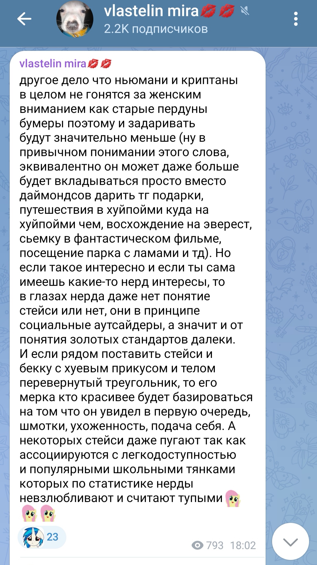 Если кому интересны еще делулу пациенты, советую канал жены бывшего популярного тиктокера Худси Бишопа. Регулярно какую-то хуету постит про отношения, есть фиксация на чедах и стейси, своей внешке, иногда пишет про чакры и прочую эзотерику, раньше продавала свои фото дрочерам, теперь скрывает это и строит из себя традвайф. Инфантильный и очень закомплексованный пациент. Худси ей изменил, пару лет была драма про то, что она не может его простить, а потом он начал возить ее по япониям и бали и она закоупила, что проработала все с психологом и теперь они нормально общаются. То, что они сношаются, отрицает, якобы они теперь реально друзья, а не как раньше, когда скрывали свои отношения во время пика его популярности. Сама мира среднетян, которая в свое время залутала куна красивеее нее, а теперь поняла, что лучше никого не найдет, ведь такие аутисты с хорошей внешкой, готовые ее обеспечивать встречаются редко.