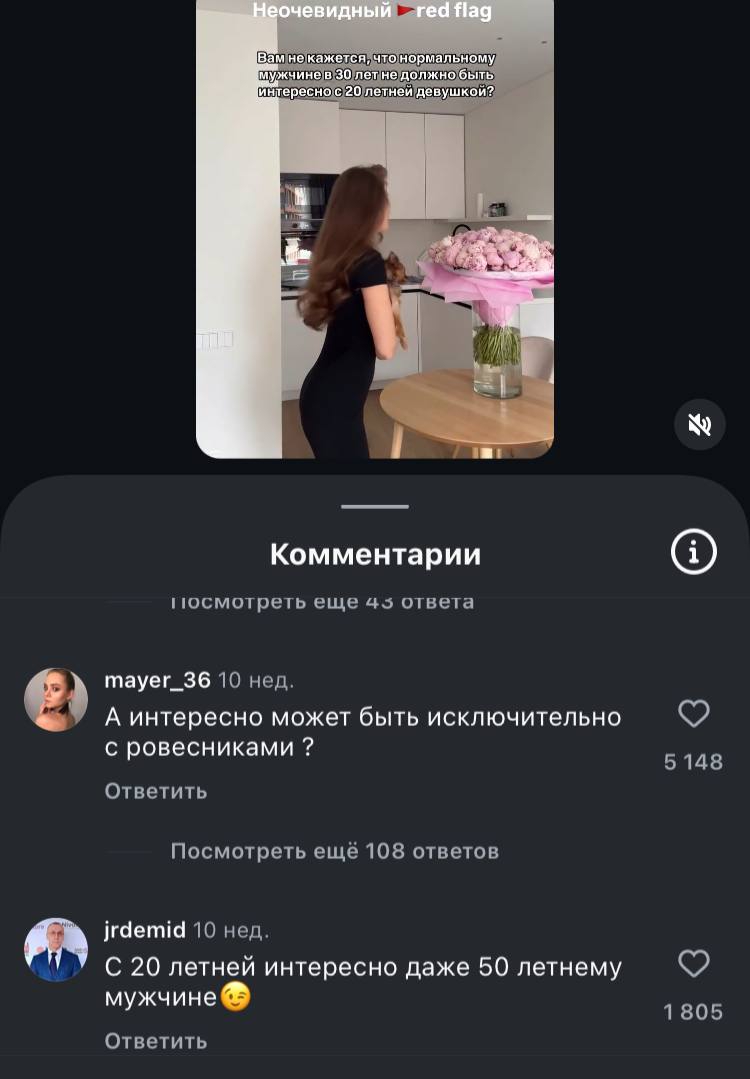 >>6258345 > даже если вы будете пытаться натягивать "тян взрослеют раньше", натянуть 20 лвл разницу все равно будет невозможно. Она вообще не говорила про натягивание и кавычки. Она прямым текстом сказала что взрослеют раньше, без какого то передразнивающего тона, и сказала что 17 и 25 по факту норма, а вот 17 и 40 нет. Дальше пошли опять примеры с 20 летней разницей и подчеркивание ТАКАЯ БОЛЬШАЯ что еще раз утверждает что для нее разница норм, главное чтоб кун был старше но не годился в отцы. Нормальный видос звучал бы совсем по другому, что нет блять, девочки взрослеют раньше когда вам 12-15 а в 16 уже сраниваются. Нет, отношения 17 и 25 не норма, даже 17 и 22 это пропасть. Тогда о 40 летних не пришлось бы говорить весь видос, достаточно сказать что это совсем уже дикость и откровенная педофилия форматом «под суд» когда годится в отцы >>6258346 Все правильно я слушаю, просто я ее не знаю, то есть не фанатка и не натягиваю желаемое на действительное из ее речи