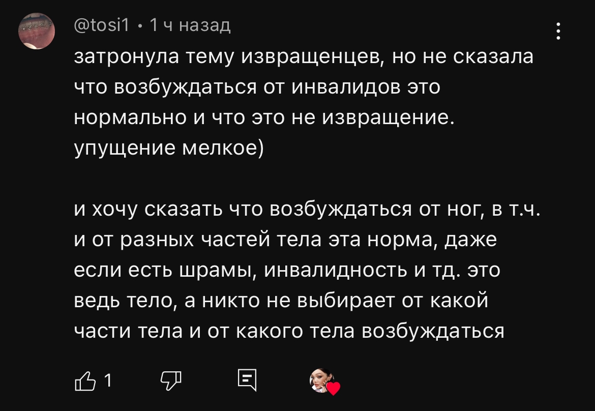 >>6258402 "меня умиляют (сказано без иронии) родители, которые понимают потребности свои взрослого ребенка инвалида и заказывают ему проституток, я даже помню историю про лежачего инвалида, которому заказали проститутку и она с ним так мило разговаривала и пила шампанское без брезгливости, это мило" пиздец с самого начала ролика