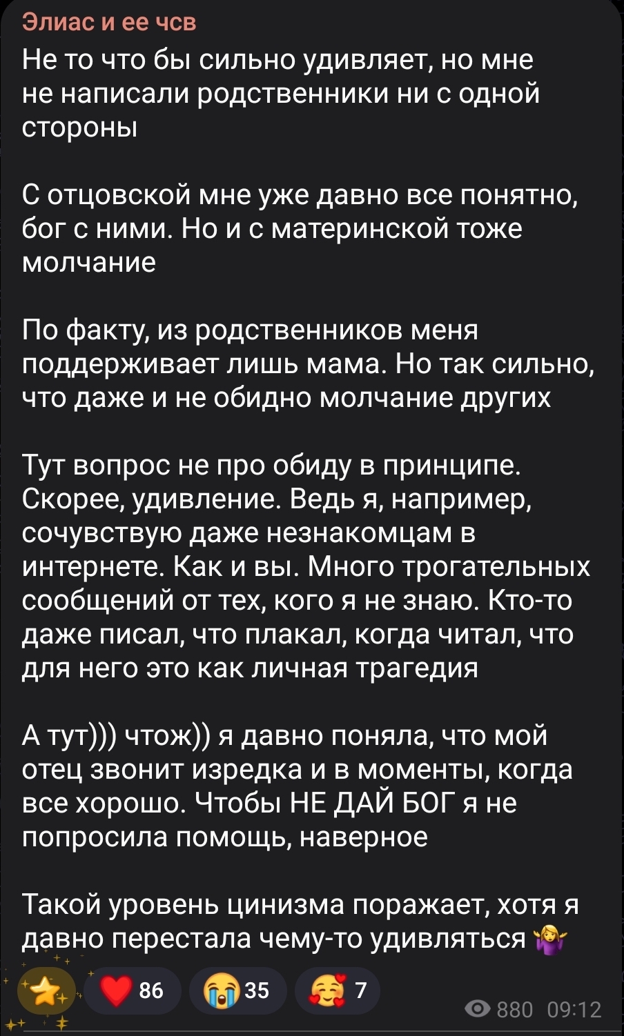 >>6259755 Да, ждать от родственников какой-то прям поддержки это прям такое. Не, я хз, может у кого-то в всж есть чуткие, включенные, эмпатичные и тд и тп старшие родственники, но у меня и у большинства моих друзей они скорее готовы помочь делом (типа отвезти забрать вещи после расставания, поделиться едой, пустить пожить на время, забрать с аэропорта и тд), но на словах поддержать не умеют (что неудивительно, люди видели некоторое дерьмо, как говорится, че сопли распускать). Я вот то же с годами замечаю, что проблемы младших становятся для меня все более незначительной хуйней (я 30 лвл), и мне реально влом жалеть и сочувствовать. Ну вот, а в ситуации Элиас что можно сделать? Ну еды привезти, хз. Так у неё у мужа сеть ресторанов, нахуя ей еда. Деньги вроде есть, на клининг и на что угодно. Делом не поможешь, а всякие сопли типа «я всегда рядом», «мне очень жаль, что с тобой это случилось» это ну нетипично для взрослых людей в всж в основном.