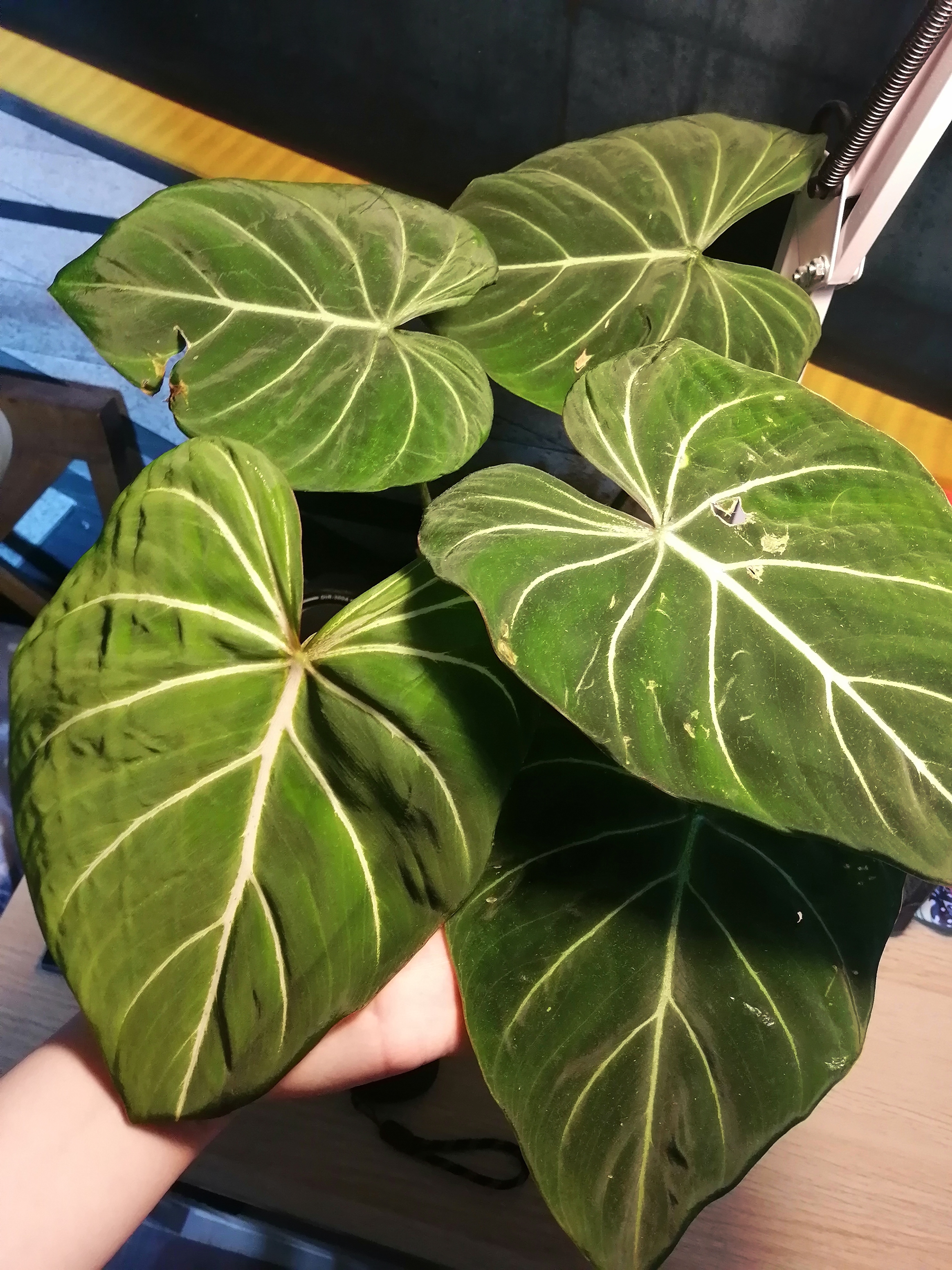 Подарок на др - филодендрон глоризиум Красавчик, люблю насыщенные зелёные листья. Пока тащила домой - помяла, а потом еще и поставила на подоконник, эт я зря, конечно, вон имеющиеся листья пострадали. Но новый листочек слева внизу развернулся целый и красивый. Цветок пытается уползти из горшка, буду думать какую-то опору ему. Стоит в довольно слабо освещаемой комнате, на тумбочке под настольной лампой.