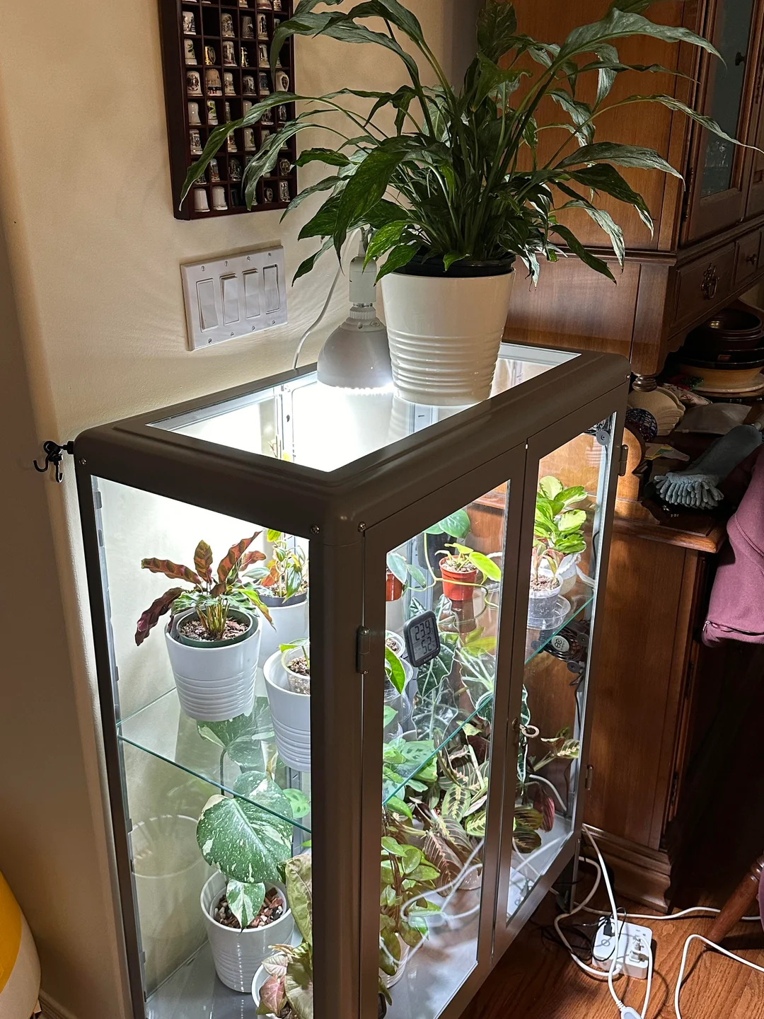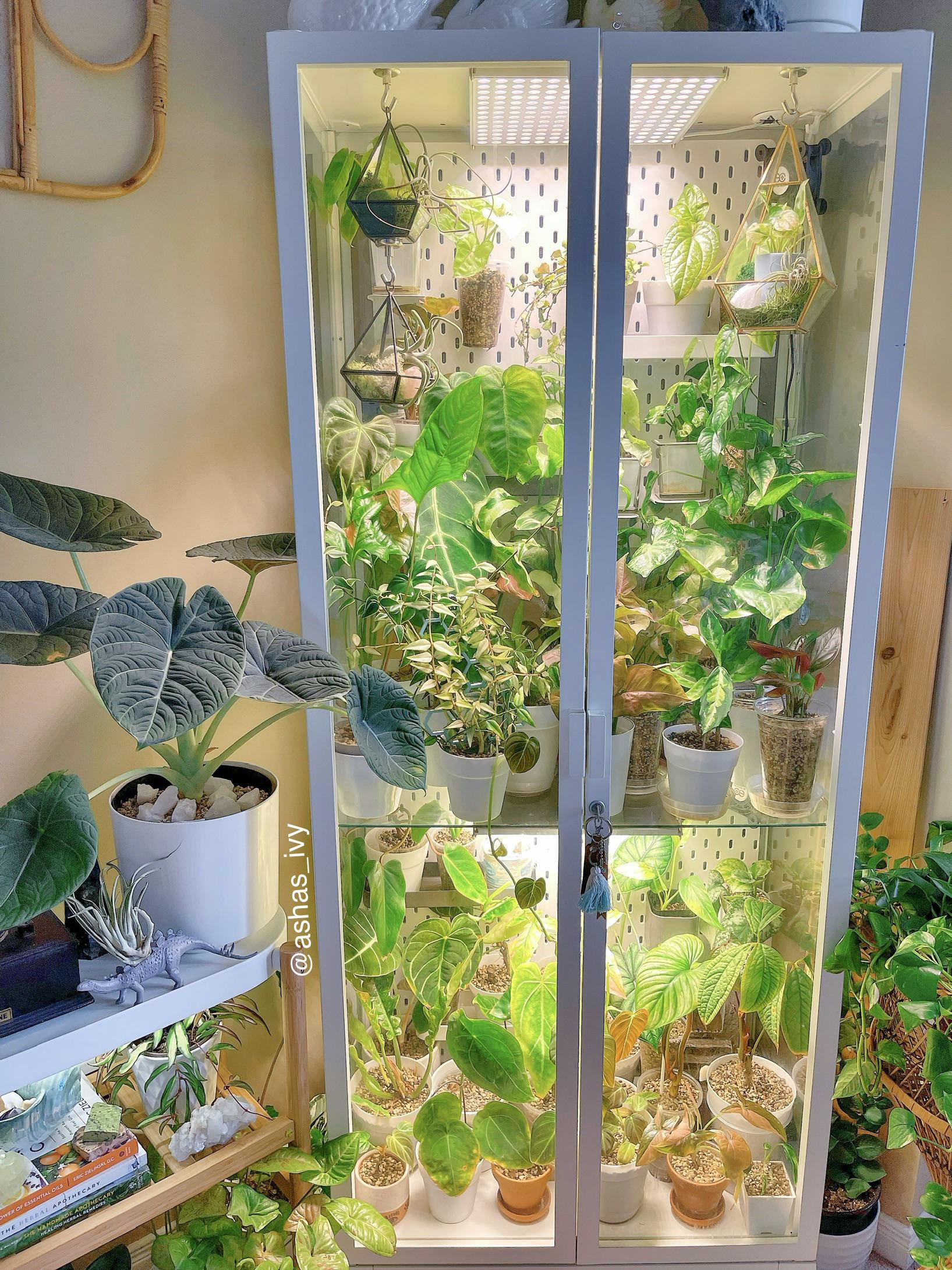>>6251474 >с регулируемыми по высоте полками Сразу непрошеный совет - расстояние между полками должно быть повыше или регулироваться, да. У меня стеллаж типа пикрил, высокий, живет на лоджии утепленной круглый год, расстояние между полками побольше, чем на фотке. И ikea greenhouse cabinet, погуглите, кто не в теме, в инсте по тегам и на пинтересте-реддите полно - охуенная тема, и как украшение интерьера, и с практической точки зрения (пикрилы 2-3-4). У меня икейный бирюзовый шкаф металлический, а так подойдет любой - из салона стеллаж стеклянный (бывают на авито), медицинский шкаф металлический, та же икеа, в общем, на что фантазии хватит. Главное - не деревянный, сырость-с, влага-с. Внутри у меня живет в большом отвесе аква-лампа, она греющая, и диммер к ней - там выставлен автомат рассвет-закат, само всё включается, постепенно свет становитяс ярче, потом к концу дня тускнеет и выключается. Там живут тропические всякие товарищи, темпра 26-29, прыскаю им там когда не забываю, чтоб влажно было. В нижнем отсеке помельче лампы с али для растений, диодки тоже, не греющие, белые - там те, кому не надо жару, но нужен свет. Шкаф иногда проветриваю, но он и так не герметичен. На задней стене висит икейная доска с дырками, на ней крючки и полочки для подвесных горшочков. Периодически у меня там кто-нибудь вырастает, крепнет - и уезжает наружу, внутрь заезжает очередной мелкаш (люблю выращивать из мелкоты крупное). Смотрела туторы, как заморачиваются забугорные растениеводы - кто-то изолирует полностью шкаф от сквозняков, внутри увлажнитель, всякие датчики - я так не парюсь.