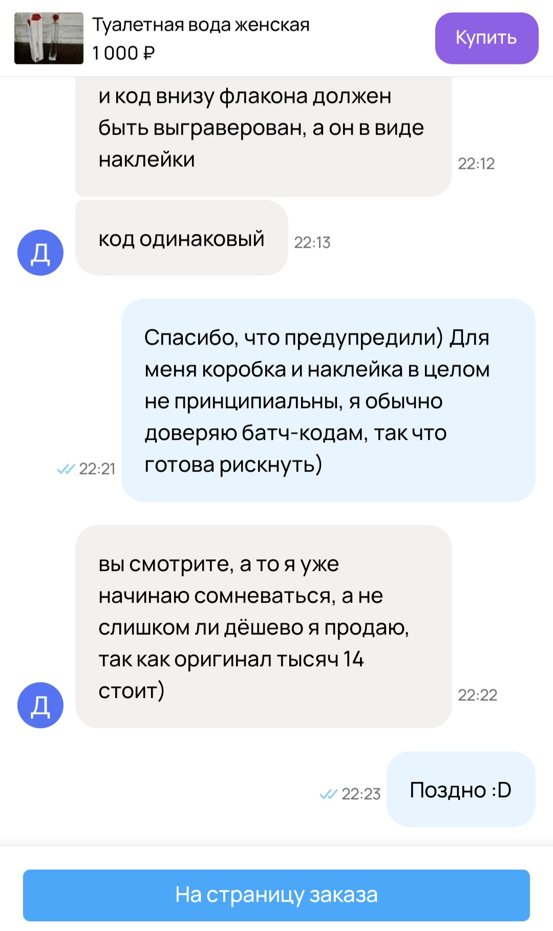 Лол, мущина продавал на авите Flower от Kenzo полный флакон 100 мл за 1к рублей... Попросила батч-код, закинула фотки флакона и дна в жэпэтэ. Ии говорит, все ок, флакон аккуратный, текст ровный, кензо выпускают такую версию rechargeable, батч-код такой встречается в отзывах покупателей. Ну за 1к не стрёмно и паль купить в целом, но ставлю на то, что мужик просто не шарит. Хихикаю, как он сам напрягся с наклейки вместо гравировки, а увидев моё спокойное "мне норм, я беру" уже засомневался в своих сомнениях. Эх, пацаны, хоть бы изучили базу прежде чем парфюмы мамки распродавать