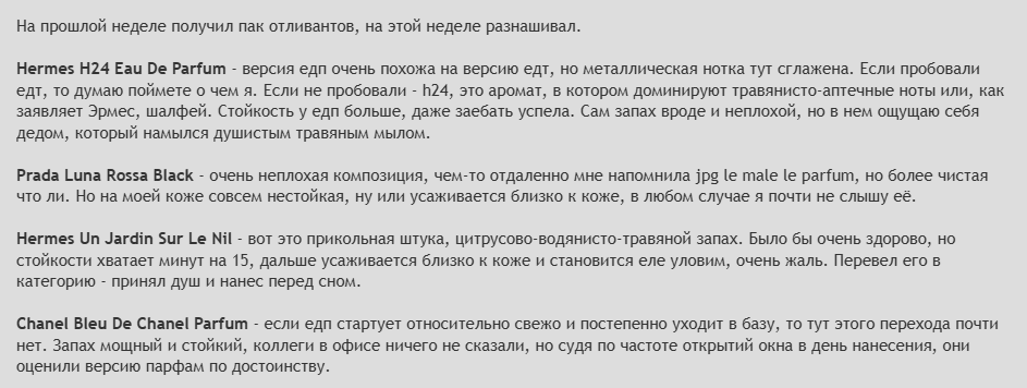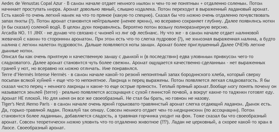 Блин очень завидую вам сисы, которые разбираются в парфюмах, всякие ноты могут ощущать. Тоже так хочу, но для меня все либо слишком приторное, либо слишком тяжелое и воняет. Моц нос воспринимает только эти три аромата, и то, самую любимую зеленую флору бай гуччи сняли с производства