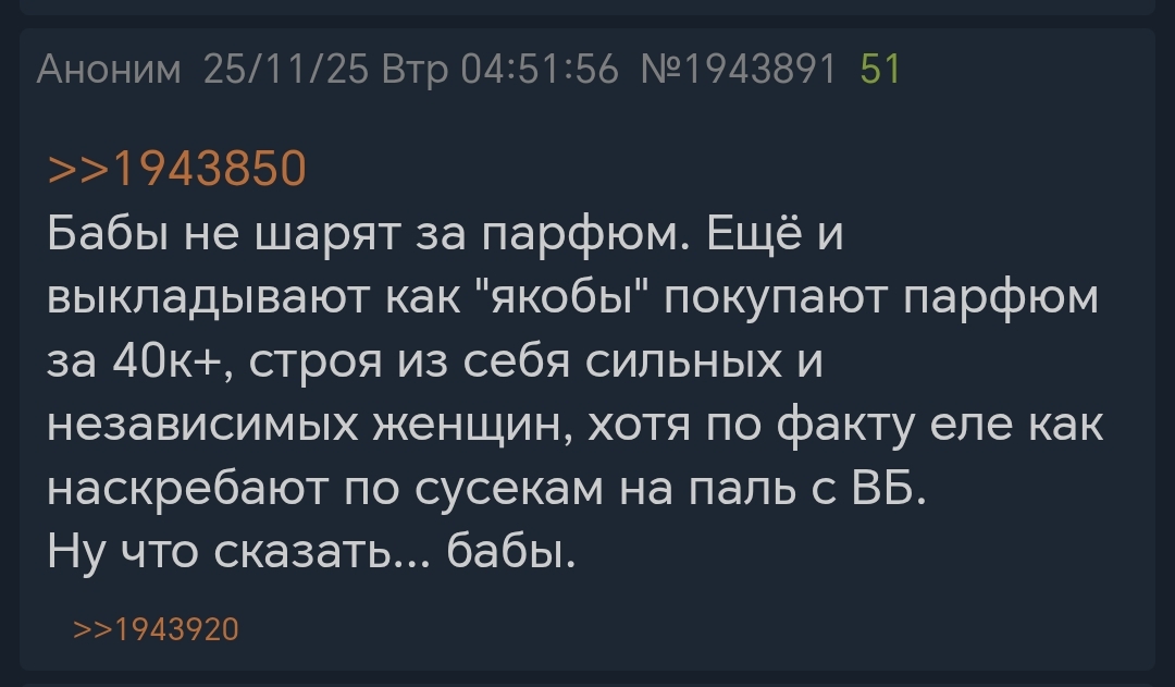 Как же тяжело найти бюджетную парфюмерию, которая хотя бы будет приятной и не удушливой, про выебоны чем-то уникальным речь даже не идет. Я что ни нюхаю, везде подвох - чаще всего начинают ебать мозг какой-нибудь ландыш или жасмин, но это может быть личная непереносимость, еще встречается сандаловая бабушка, пачулиевая земля из-под бабушки, не знаю что выдает свежепобритых дедушек, но встречается, лотос вместо медитативного созерцания речки-говнотечки обязательно выпуситит дерьмодемона, лилия кстати тоже, гнилые фруктики, кошачие лотки, ну и в худшем случае будет аромат горящего нефтеперерабатывающего завода. Накидайте нищебродских парфюмированных изделий от которых не хочется сразу отмыться что ли