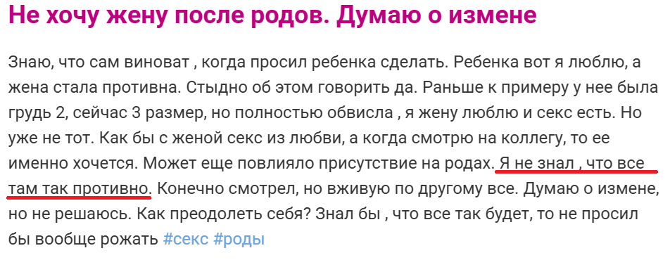 Ничего, мы все жертвы вот этого 《ЯСАМА, МУЖЧИНА ДОЛЖЕН ВИДЕТЬ МЕНЯ ТОЛЬКО СЧАСТЛИВОЙ》 Наши прадедушки роды у наших прабабушек принимали, и никто не умер Последние поколения сделали из мужиков каких-то соплежуев, у которых член падает, если увидят волосок на очке. Так что в наших же интересах способствовать размножению мужчин, которые не боятся пуповину своему ребенку перерезать, а трусливые слабаки с низкой потенцией должны перестать плодиться