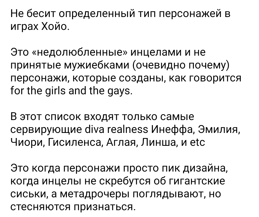 У вас есть тян, которые вам нравятся в ляоподелиях? Не важно чем, характером или дизайном. Мне в каловозе нрав дизайн аглаи (жаль что в сюжете никакая),зарянки. А характер наверное у херты, жруань и фейсяо норм. В гашню давно не играла, но чисто визуально нрав фурина, арле и навия, за исключением уебанской шторки для прикрытия пизды вместо ткани спереди у платья.