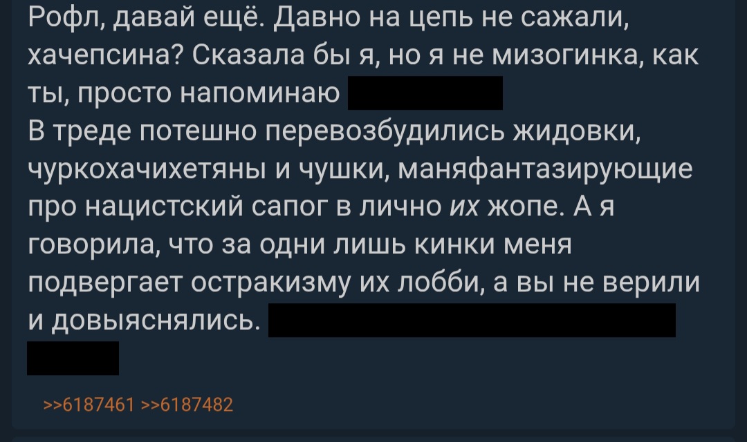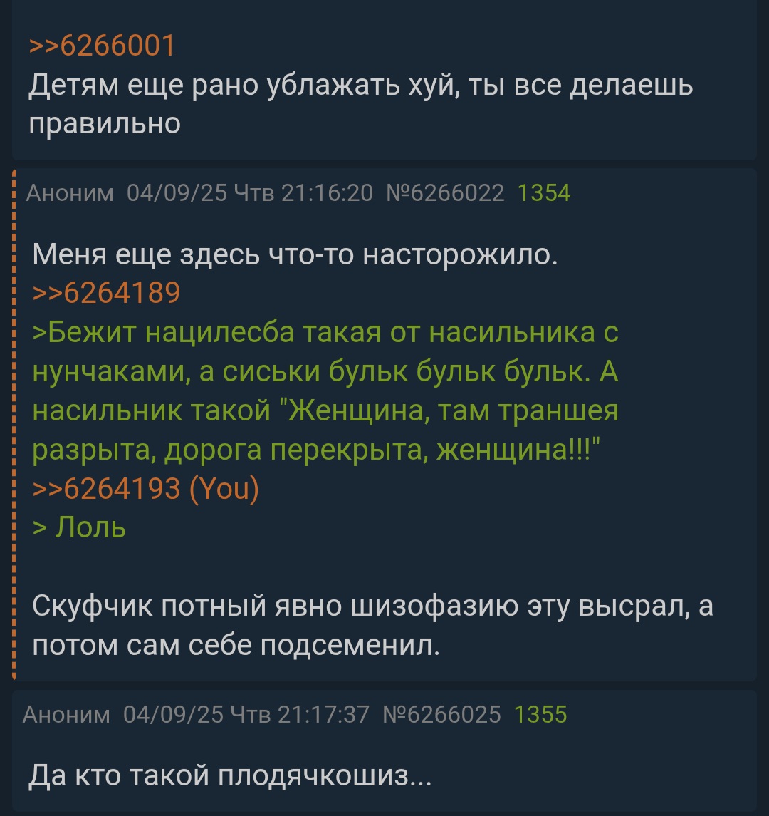 Ндам. Странно еще, что та, кто из нацилесбы вытягивал про ее фетиши, больше не появлялась. Неужели один шиз эту многоходовочку спланировал? Развести лесбу на откровения о фетишах, заклеймить ее наци и мизогинкой, а потом из треда в тред это повторять как заезженную пластинку, попутно пропагандируя традлайф и плодячку. И вот эта хуйня кормится с моих налогов, пиздец.