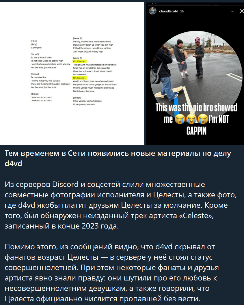 Брат Селесты сообщил NBCLA в среду, что члены семьи, которые всё ещё живут в Лейк-Элсиноре, скорбят и знают, что девочка была знакома с певцом D4vd. Мэтью Ривас рассказал, что когда его сестра исчезла, она шла с ним в кино, но так и не вернулась.