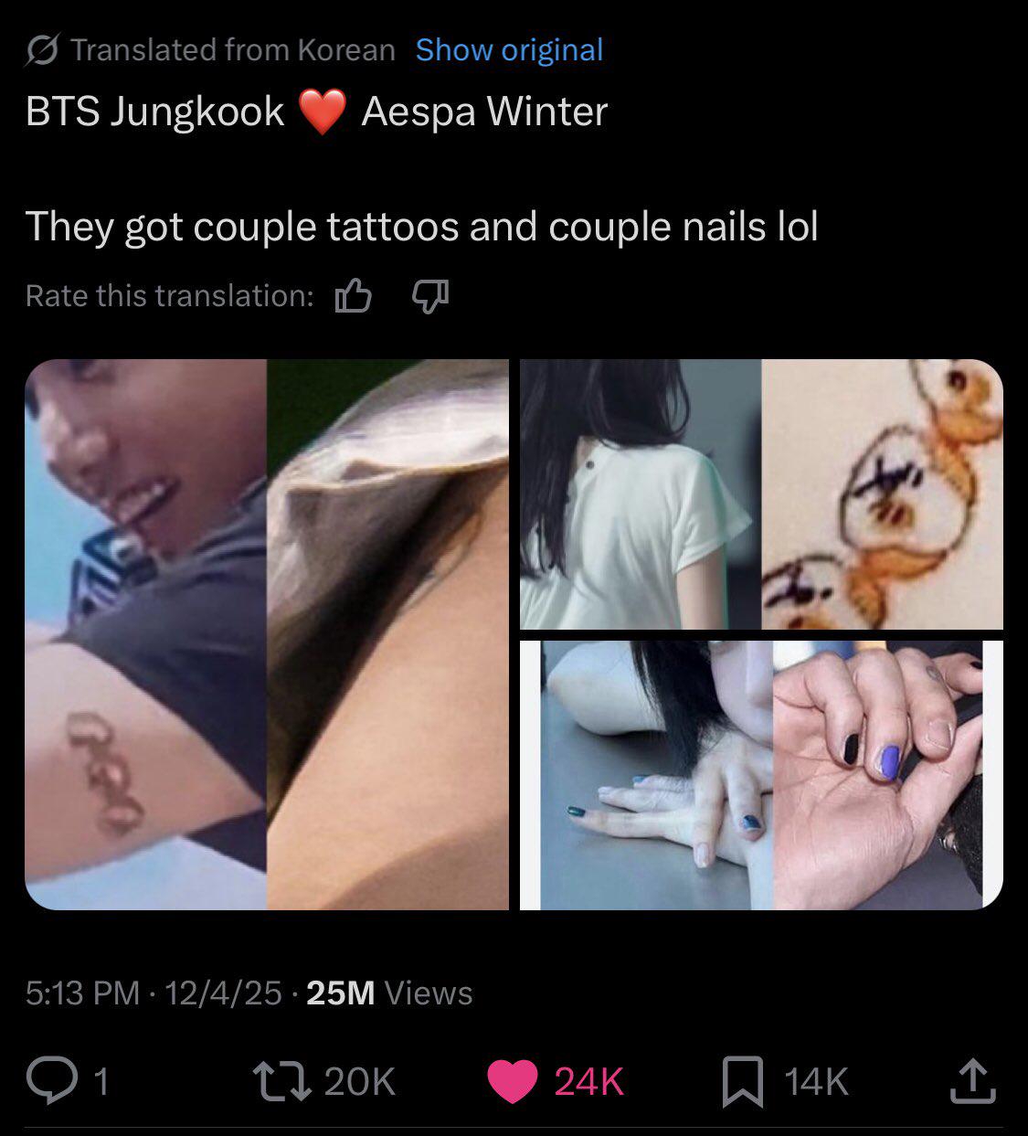 >>6362062 Вообще интересное происходит: хайб сейчас квирбейтит с шоу Чонгука и Чимина, это честно говоря какой-то пиздец, т.к. челам под 30 и они прошли армию. Есть ли вообще группы, которые после армии так себя промотят чисто для шипперов? Чимин в этом году попался на романе с Даен, который длился не один год, Чонгук с Винтер и в итоге нет хайпа у шоу, соло арми, джикуки психуют и уходят) мелтдаун в твиттере и виверсе Чонгук ебанутый на голову, раньше у него были отношения с японкой тату мастером Миджо и он скопировал ее пирсинг и тату, все как будто об этом забыли, ее так травили, что она чуть с собой не покончила. Щас с Винтер история повторяется. Одинаковые татушки, она носит его одежду, их видят у его дома, он посещал концерт аеспы еще в марте, в Японию гонял к ней, пруфов дофига.