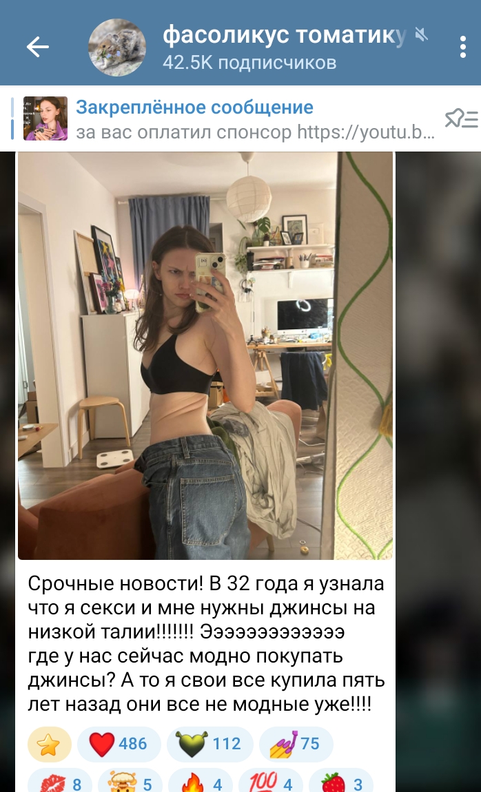 Консерва на антидепрессантах чето активировалась. Сексуальной себя почувствовала, сейчас и асексом себя называть перестанет, и фотки в облегающих платьях постить начнет, скриньте. Кстати, всегда в ахуе с того, какие всратые, на несколько размеров больше джинсы она носит