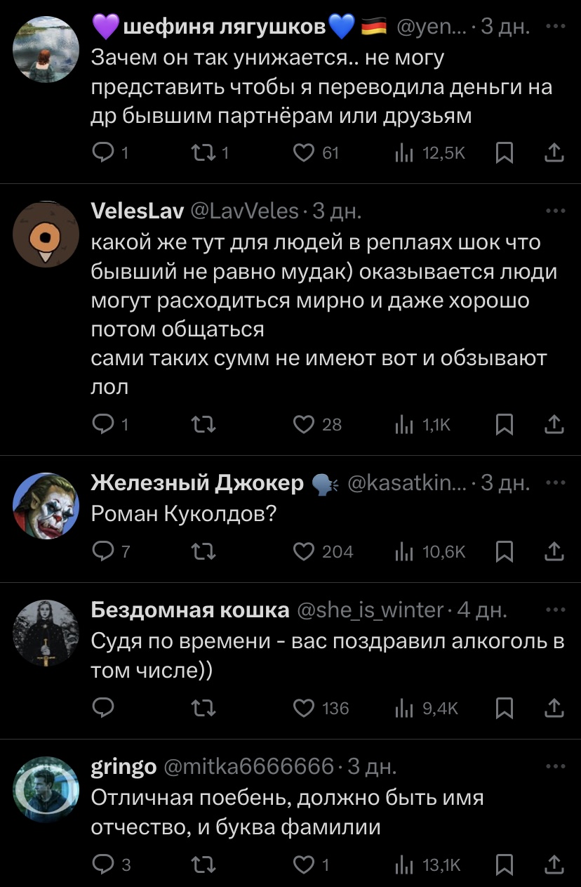 Щедрость Хуйлада Гадилова пошла на спад. Землеройка сначала была продавлена на порношары, сейчас из ее жизни исчезли рестики и она стала обслугой-кухаркой. Ждем постов про то, как надоели клининги и химчистки, какое счастье оттирать толкан от говна любимки и стирать его потники