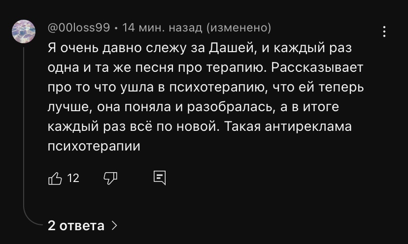Странный доёб от подписчика. От психотерапии может постепенно становиться лучше. Одно проработали, потом другое, потом ещё что-то вскрылось и с этим тоже начали работать. Буду рада, если дася дойдёт до проработки своих бдсмов. Тот подкаст вышел очень пугающим.