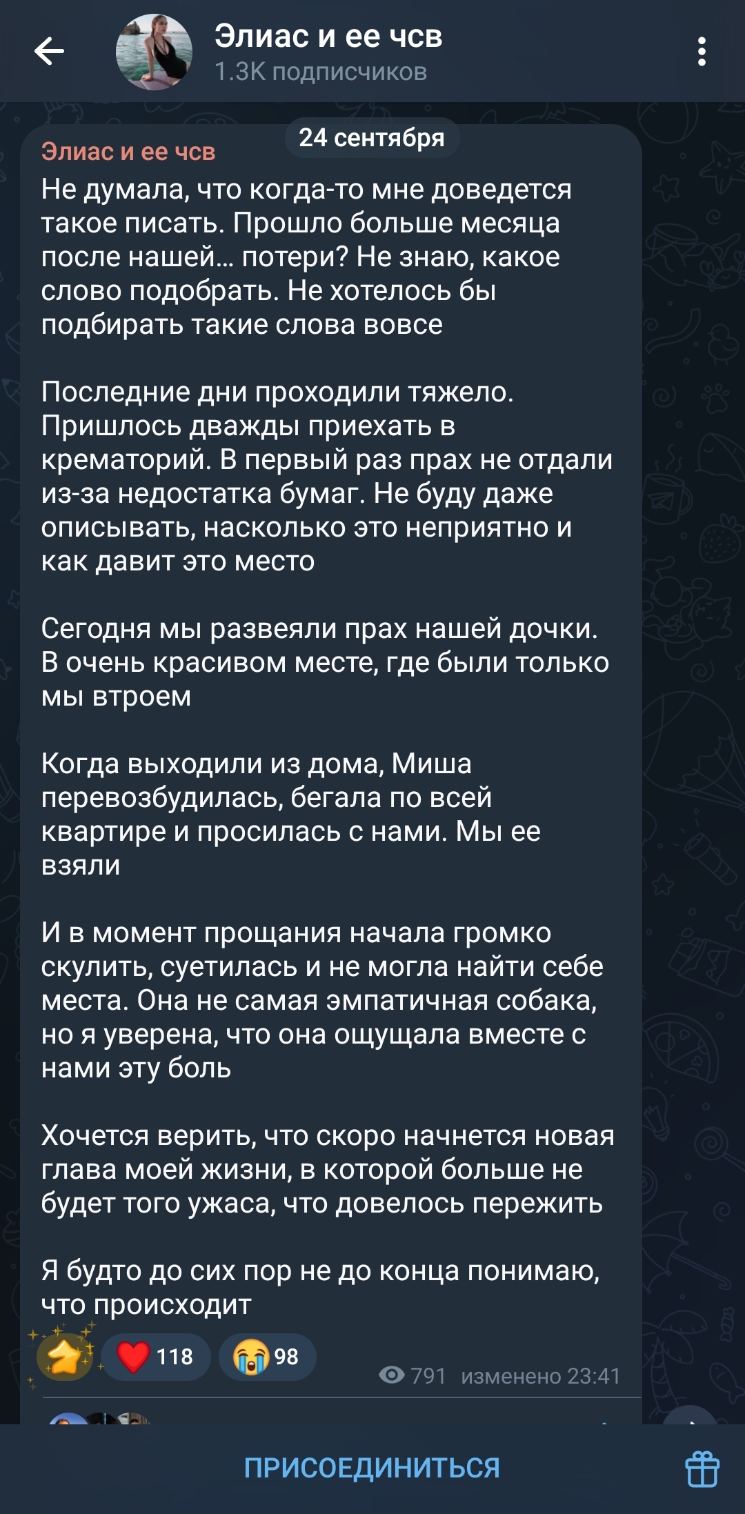 Желаю, чтобы эта новая глава действительно наступила как можно скорее. Чтобы сердце постепенно оттаяло, а память оставалась светлой и тёплой. Время, оно такое — лечит медленно, но верно. И поддержка близких, как в этом случае муж и собака, — это огромная опора.