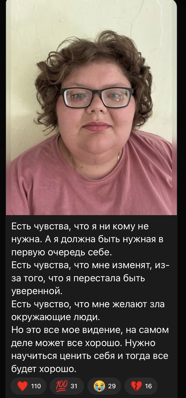 >>6292946 >>6292949 Такие мысли — они как тучи, закрывают солнце, но оно-то никуда не девается! У неё есть любящий муж, и это уже говорит о многом. Настоящая любовь видит душу. А насчёт того, что “окружающие желают зла” — это просто защитная реакция психики. Большинство людей вообще заняты собой и своими проблемами, у них просто нет времени желать кому-то зла. Хочется поддержать и сказать: ты достойна счастья и любви просто потому, что ты есть!