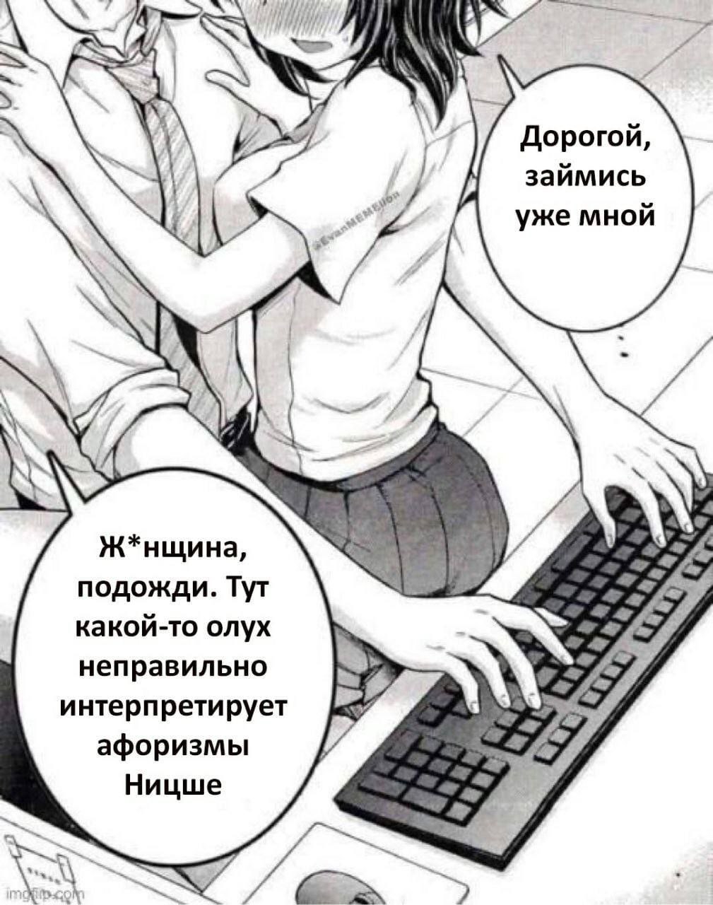 Даже после этого >>6299591 сложно? Напоминаю, не Ницше, другая тема для срачей. Дальше у меня остались только совсем очевидные мемы, увы. >>6300234 У первого мема вайбы жены Какухид, но я не помню, сидит ли она в треде.