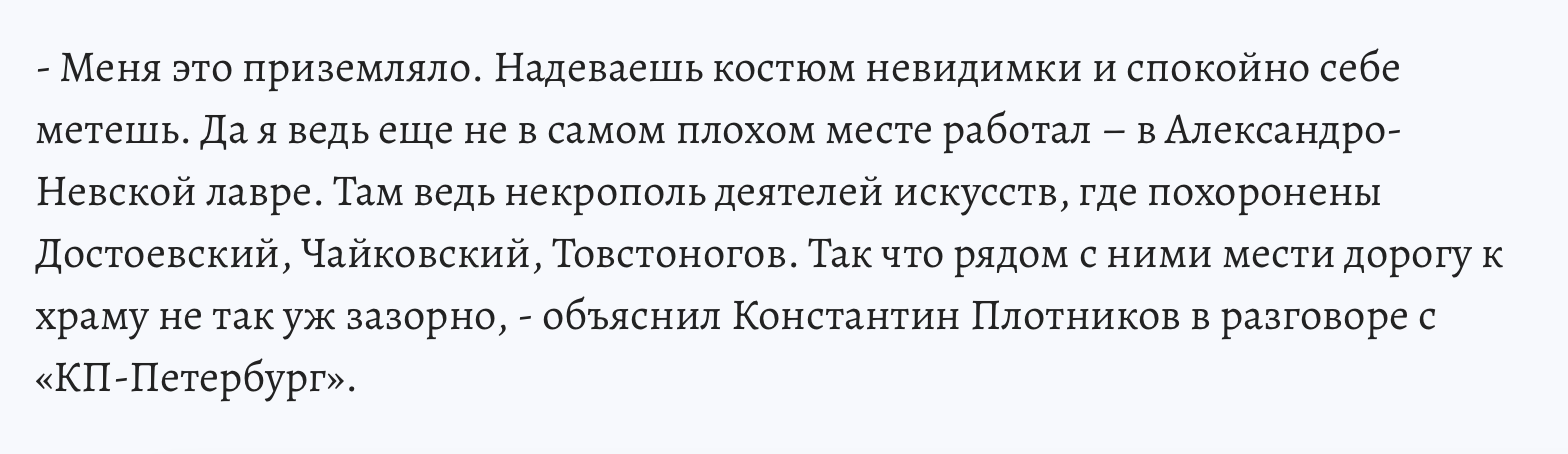 >>6294715 смотрела с ним пару подкастов, он всегда говорил, что ему такая работа просто нравилась. Что во время физического труда можно разгрузить голову, почти что медитация своего рода. Ну и работал он дворником при Александро-Невской лавре, типа такое не зазорно. Во время учебы в театрально он уборщиком работал в тц. Тоже говорил, что нравилось приходить до открытия, включать наушники с музыкой и пылесосить. А работа в офисе/ продавцом требовала бы больше ответственности и вовлеченности в процесс.