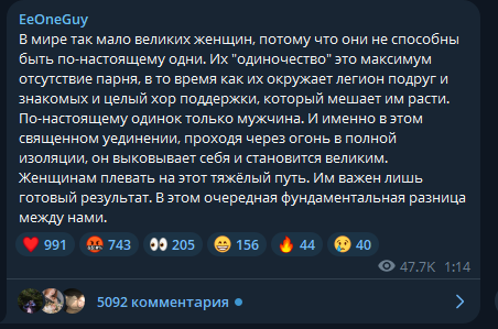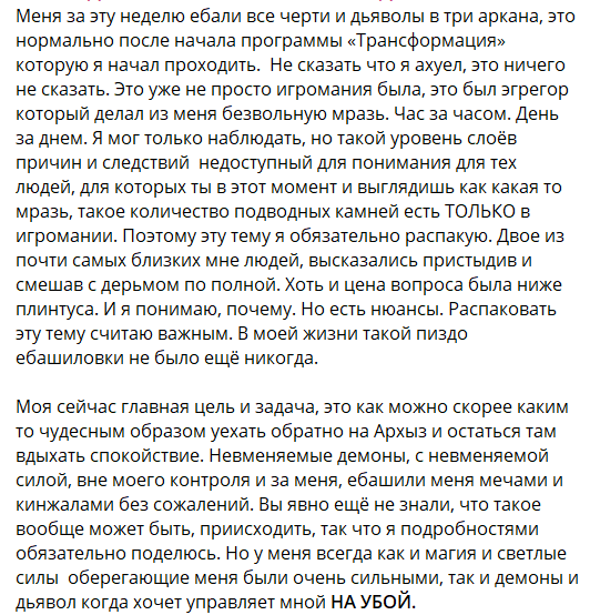 >>6294854 Рандом-болталки в дисе, разные рулетки, где еще часто подвыпившие глубинарии и проч. Не могу сказать, что какие-то откровения, просто особенности мышления. Ну, одна из особенностей, но для кого-то, возможно, неочевидная - ни один моральный урод, жестоко поступающий с тян, себе не признается в этом никогда. Например, когда у куна много одноразовых связей, он не будет думать, что он поступает как-то плохо, он думает про этих тян, что они шлюxи и для них это норма. Когда я спрашивала такого, почему он уверен в этом, он сказал, что "Это видно. Я же вижу, как они сосут и т.п." Один кун ходок по проституткам говорил, что считает себя их "спасителем", потому что он всегда "заказывает классику, а не извращения", потому что он считает себя симпатичным и у него были тян, а значит он лучше других ходоков и с ним проститутки как бы "отдыхают". Большинство не упиваются тем, какие они злые, они всерьез считают себя хорошими. Ну и рефлексия убитая у большинства таких, много самовранья, много слышала и стори про бывших стейсяр, перед которыми прогибались, тоже не осознавая это, у них уже другой мужик, а они все забыть их не могут. Разное, короче.