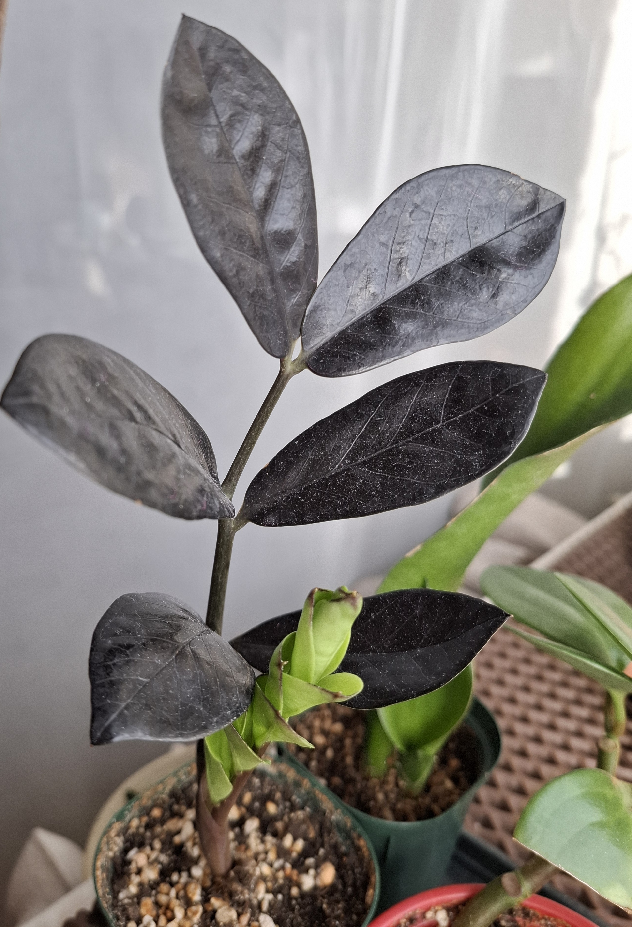 Мой замик стоял ни жив ни мёртв практически 2 года. После пересадки из небольшого транспортировочного горшка в совсем тесный стаканчик наконец пустил новый рахис. И что я вижу. Он такой зелёненький...Он потемнеет со временем? Или так и останется?