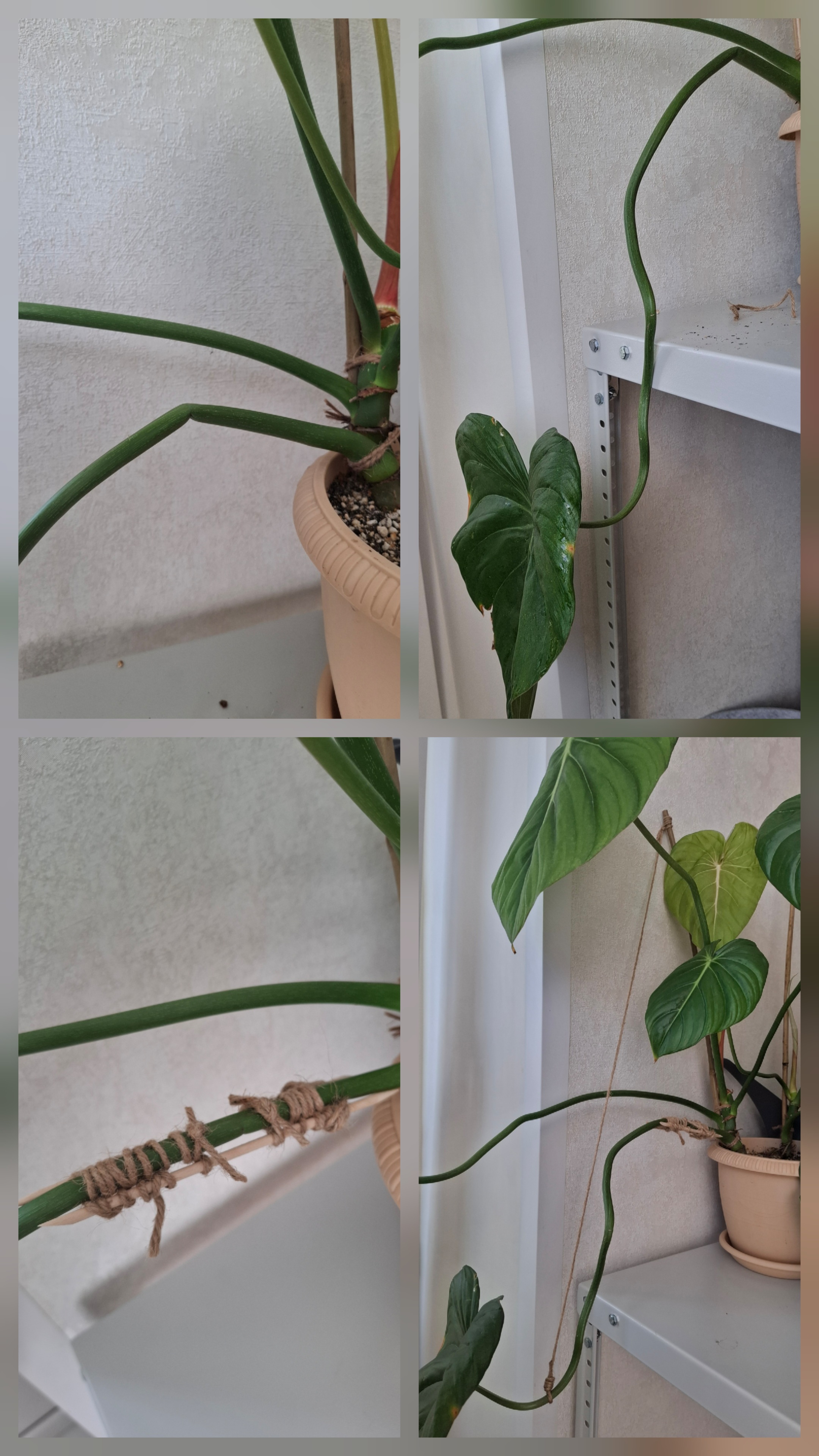 А зачем филодендрон подвязывать наверх? У них стебли как раз вполне подвижные, насколько я наблюдаю: где светлее, туда и растут
