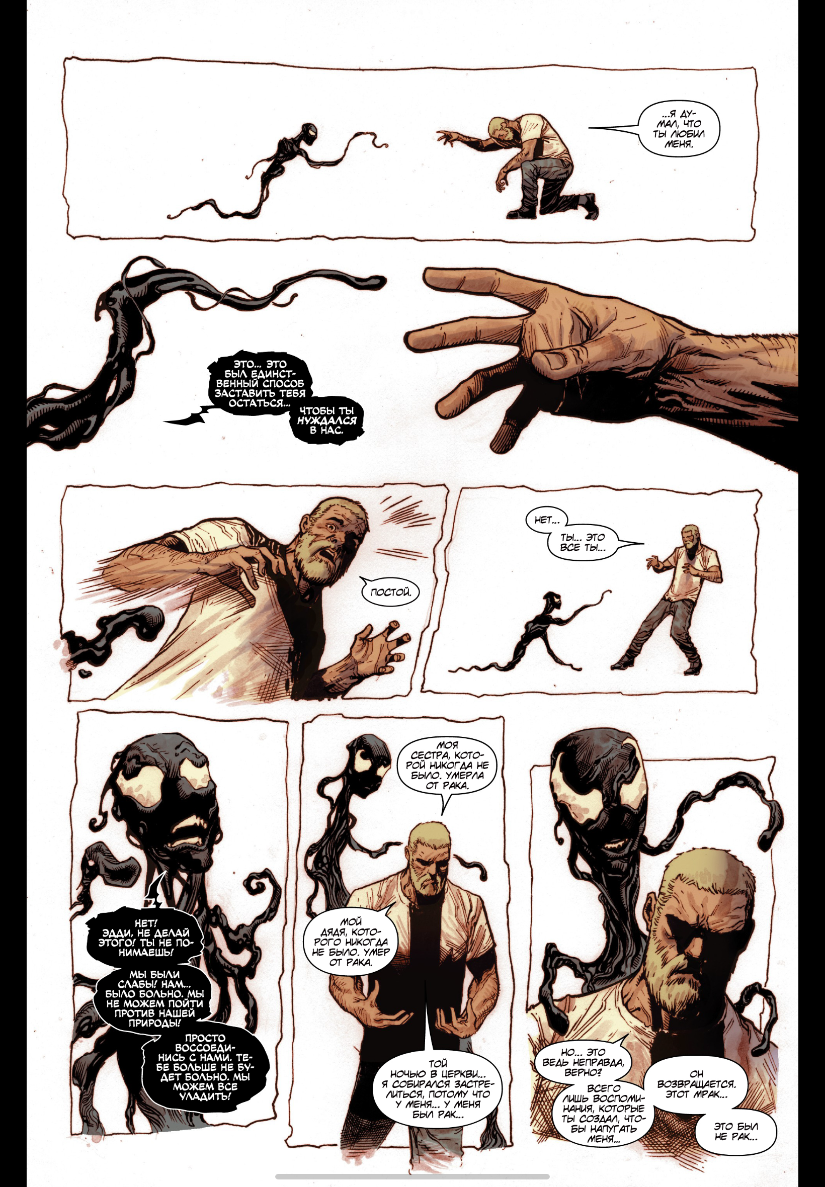 В целом 1-12 части 10/10, кайф, то что я хотела, как же я рада, что вы здесь запостили венома ради фана, прям хорошо вечер провела. Но дальше 13-35 просто пиздец, кроссоверы ебучие, куски сюжета вырваны и показаны где-то в другом месте, даже нет ссылок мол ищите в таких-то главах мстителей. 3 главы потратили чисто на мужскую фантазию фансервисную, где Эдди голый бегает по джунглям на необитаемом острове и борется со своими демонами типо, хотя на самом деле просто выживач типо. Сколько раз мы этот сюжет видели в дс и марвел, почему мужики так хотят бегать по джунглям и проводить ампутации в диких условиях, никто не узнать