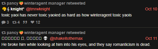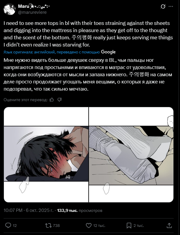 Мне почему-то строго похуй кто кого ебет и в каких количествах и пропорциях, меня в целом не слишком интересует момент пенетрации. Как только станет ясно кто первый эмоционально открылся и поставил себя в уязвимое положение, я готова закрывать фанфик/манхву, почти всегда. Во время секса тоже может быть интересная динамика, но если там просто секс, особенно секс без мыслей, чисто экшн, то не, спасибо