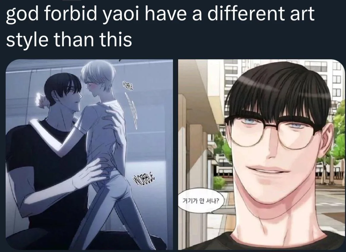 А причина того, что такого контента дохуя и того, что геи, которые казалось бы на равных, строят отношения по тем же моделям в том, что мы живём ого в гетеронормативном мире. И у всех есть этот опыт, и проблематика в этом контексте для всех знакомая.. какой сценарий вероятнее возникнет в голове у сценаристки манхв? Проблемы в равноправных отношениях, в которых она никогда не была или старый добрый абьюз