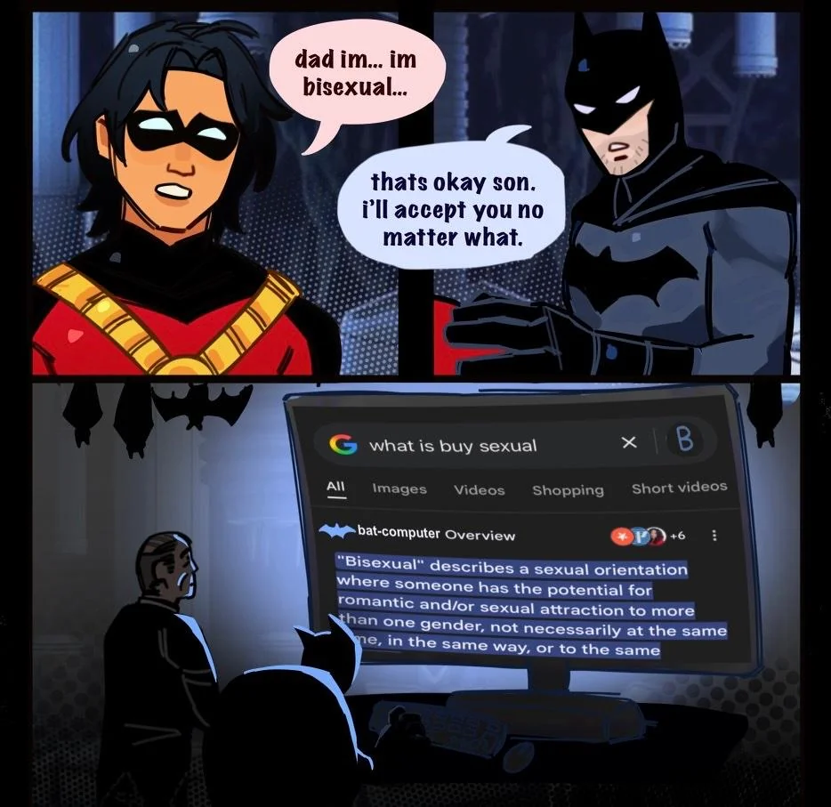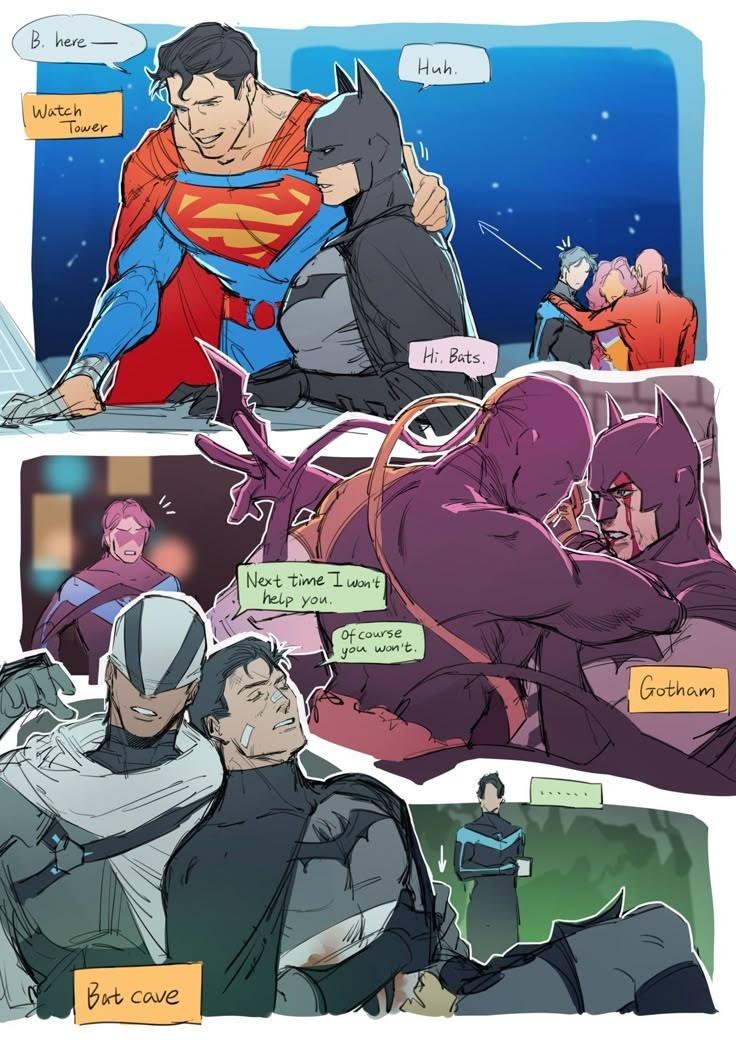 Блин, мне срочно нужно коммьюнити по бэтфэмили, я уже не могу. Пинтерест меня просто бесит. Под каждым очевидным джейдиком там коммент-оправдание от блаженных типо: хихик НАСТОЯЩИЕ братья! Как они друг друга любят ПО-БРАТСКИ. Да еб твою мать, дик его на арте в губы целует, пока джейсон его на руках держит, что здесь братского? Или другая крайность, возмущаться под каждым (реально под каждым) артом: ОНИ БРАТЬЯ вы знали они братья? При этом канонично у тима отношения со стефани, а у дика с барбарой. То есть, если ты девушка, то похуй