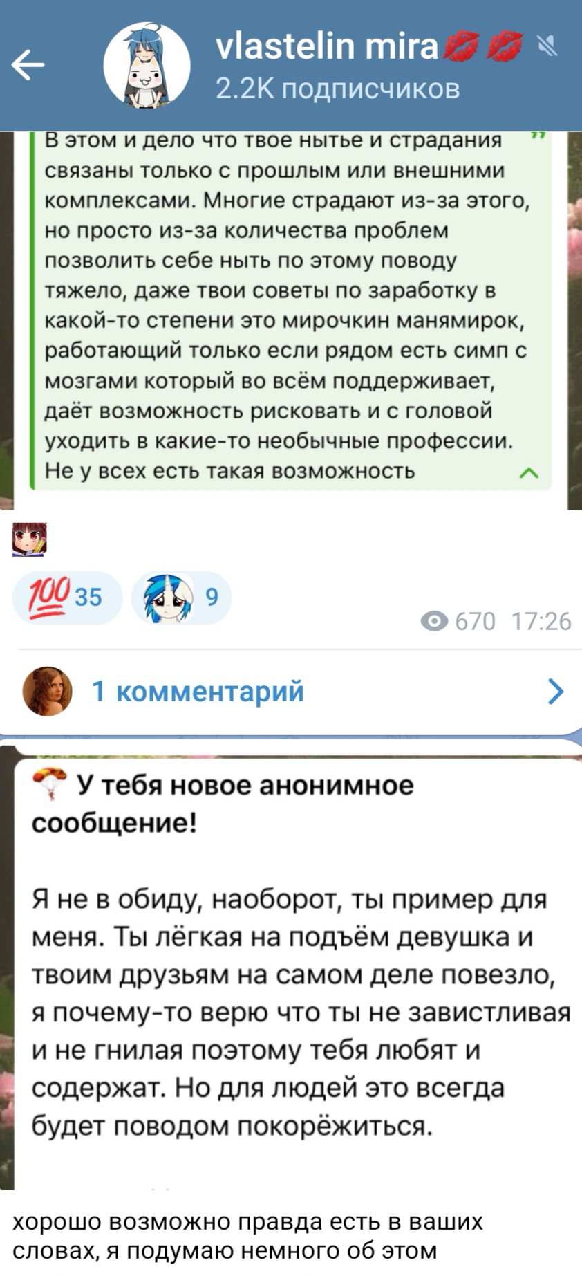 >>6301943 Чсв играет. К содержанкам у норми меньше уважения всегда, даже если вслух не говорят. Декрет это исключение. У нее еще и окружение из тех, кто реально сам добился хорошего заработка, она там как аутсайдер. Недавно таки призналась, что зря универ бросила и теперь жалеет, прогресс. Учиться, конечно, не пойдет