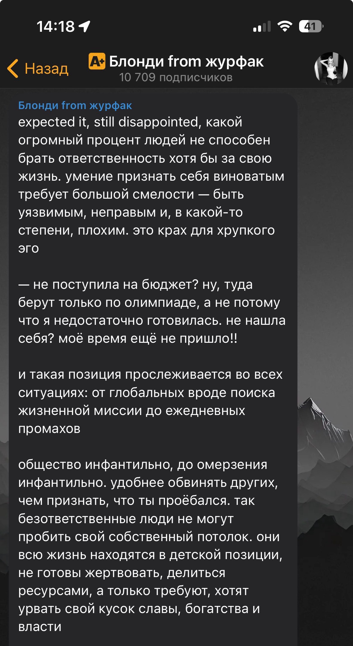 >>6307809 над чем рофлить? Над псевдофилософией которую выкатывают все студенты/тки гуманитарных направлений на 1-2 курсе из-за желания выразить себя и пробудившегося максимализма, при этом не имея опыта и глубокого понимания вещей? Ну можешь порофлить над школьниками, которые пытаются спорить с учителем о смысле "Преступления и наказания". Уморительное зрелище, видимо.