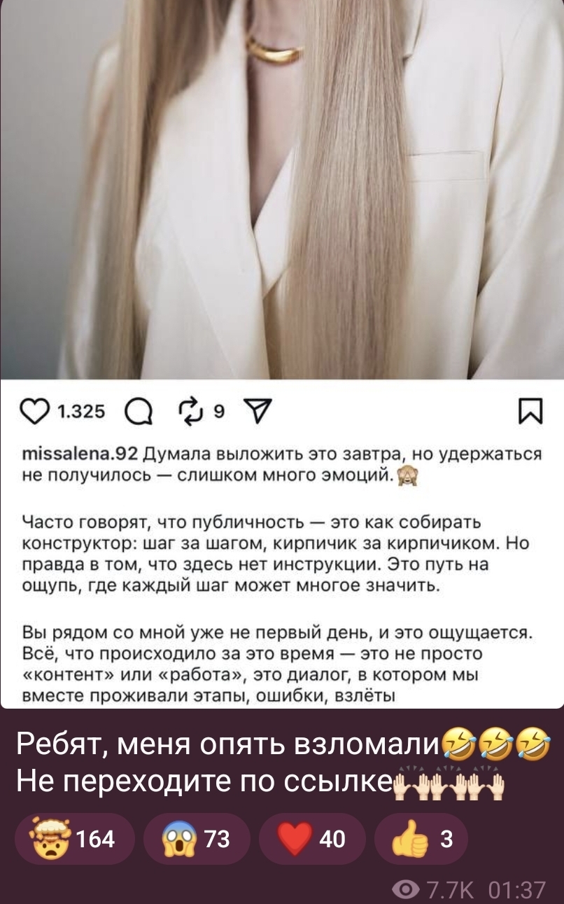 Алену Шишкову опять взломали. Жаль нашу стейси пупуню. Наверное ей щас все заскамленные будут угрозы писать Впн чтобы зайти в инстаграм они научились включать, а банальный развод отличить не могут