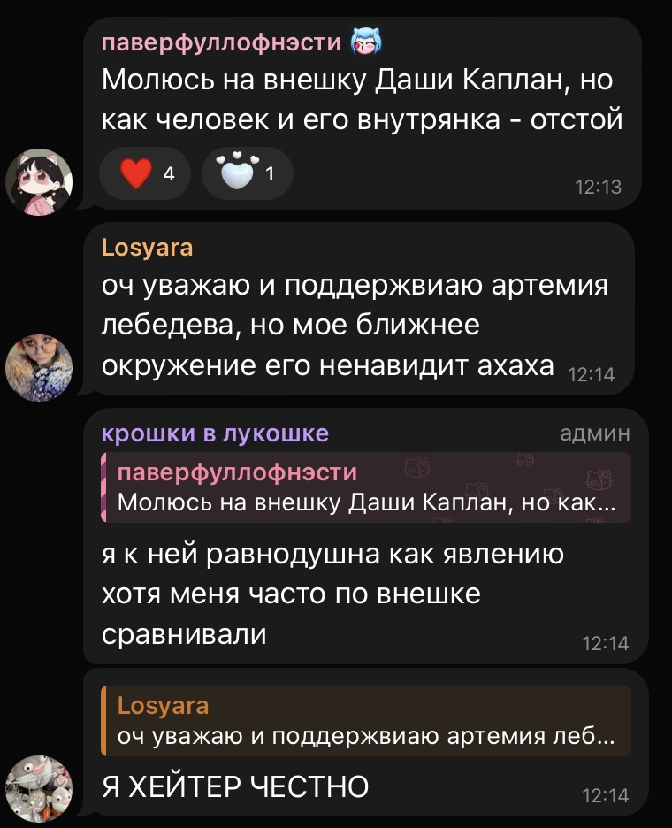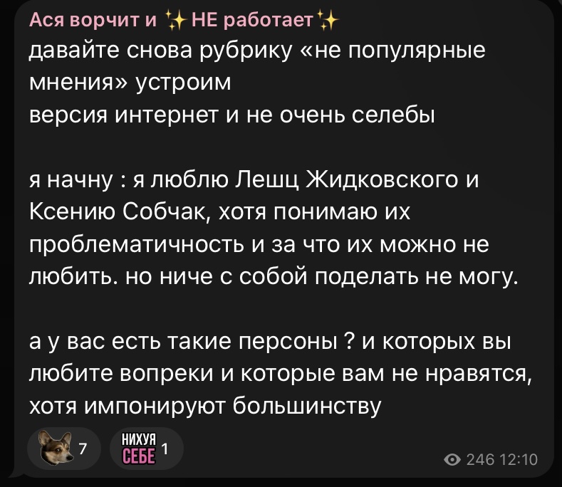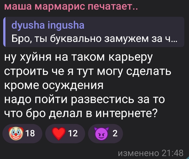 >>6308072 Меня бомбит даже не с её двойных стандартов, а то как она тупейшим образом оправдывается, стоит лишь кому-то подловить её на противоречиях. >ряяя делал в интернете А ты, блять, сейчас не об этом речь поднимала? Или теперь срать в реактах конкретных детей на свою огромную аудиторию лучше, чем рандомные токсичные выхлопы от каких-то рандомов в комментариях?